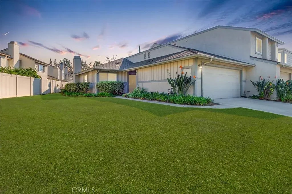 Welcome home! This charming single-story end-unit is attached on only one side, offering added privacy, natural lights, extra windows, and tranquility. This attached single family home features 2 bedrooms, 1.75 baths, and 1,086 square feet of living space. This home also includes a two-car garage with washer and dryer hookups and garage attic area with a pull down ladder for added convenience. A lush greenbelt sits right in front of the homeperfect for outdoor relaxation, picnics, and play. As you enter, youll be greeted by a freshly painted interior, soaring high ceilings in the living room, and beautiful hardwood flooring throughout the main areas, complemented by tile flooring in the kitchen and bathrooms. The open-concept layout seamlessly connects the dining area and living room, where sliding glass doors lead to a covered patio, creating a wonderful indoor-outdoor flow. The recently updated kitchen features white shaker cabinets with polished nickel hardware, stainless steel appliances, and quartz countertops. The primary bedroom boasts vaulted ceilings, two large separate closets for ample storage, an ensuite bath, and sliding glass doors that open to a spacious, private enclosed backyard. On the opposite side of the home, the second bedroom and separate bathroom provide privacy and flexibility. Located in a well-maintained HOA community, where residents enjoy access to a pool, a small park, and offers RV/boat/trailer parking (as determined by the HOA). The property also features a long driveway, plus extra guest parking conveniently located right across the home. Do