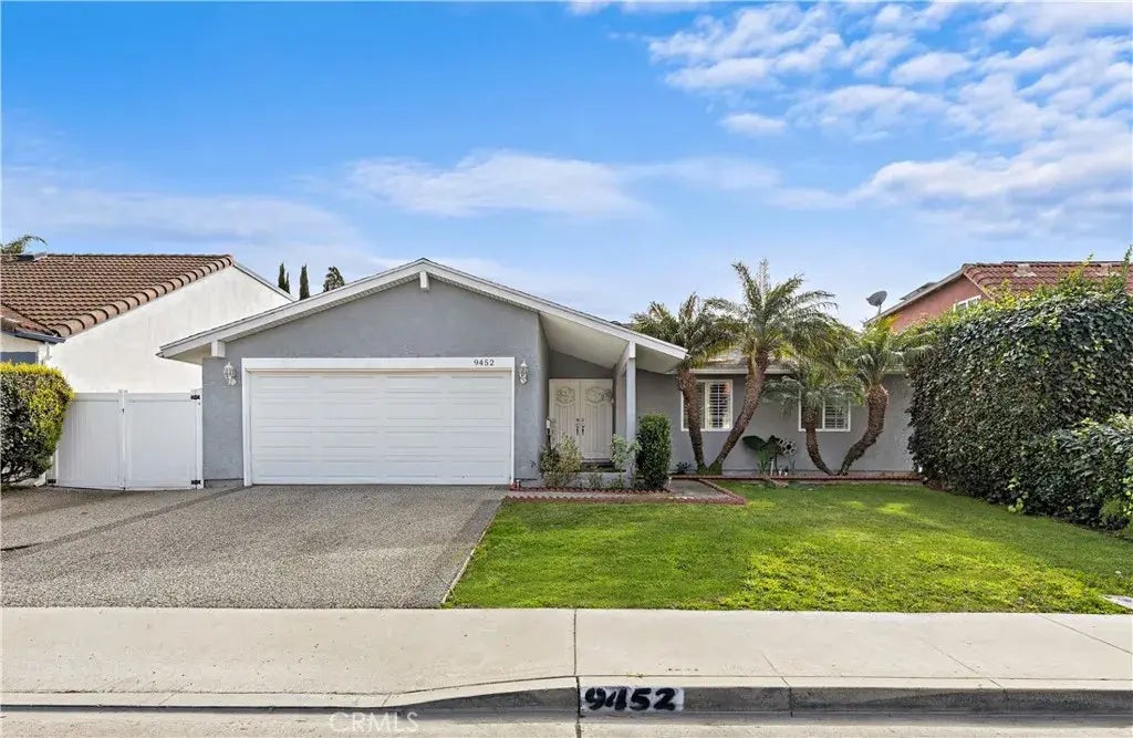 This attractive, upgraded single story home is nestled in the sought-after Century Park neighborhood of South Fountain Valley, just steps from Cordata Park. Featuring an open floor plan with dual-pane windows & sliders, and textured ceilings & decorative lights throughout. This home offers a bright and inviting atmosphere. The gourmet kitchen boasts a large island with a breakfast bar, abundant quartz counter space, a four-burner gas cooktop, a wall oven plus custom painted cabinets, stainless steel appliances, a double sink, and recessed lighting. A ceramic tile floor, laid in a diamond pattern, flows into the dining area with a vaulted ceiling, ceiling fan, and decorative niches. The highly desired family room features a cathedral ceiling, wood veneer flooring, two skylights, plantation shutters, and a slider leading to the backyard and patio. The sunlit living room welcomes you with a vaulted ceiling and a modern stone fireplace framed by windows. The private primary suite includes a slider to the backyard, wood veneer flooring, computer niche, mirrored wardrobe closet, and an en-suite bath with an oversized designer tile shower, frameless glass door, matching tile flooring, a skylight, and a built-in wood vanity. The hall bath mirrors this elegance with a tile shower/tub, frosted glass doors, matching tile flooring, and a skylight. Additional bedrooms offer plantation shutters, ceiling fans, and mirrored wardrobe closets, with one featuring double doors off the entry hall. The private backyard boasts a spacious lawn area accented by custom hardscape and a generous patio
