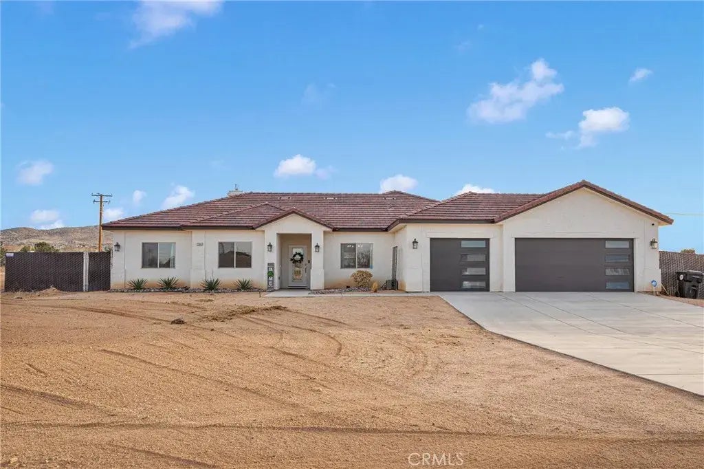 Welcome to 22655 Via Seco Street, a beautifully crafted single-story home in the desirable City of Apple Valley. Built in 2022, this custom residence is set on a sprawling 1.46-acre lot, offering stunning desert vistas and newly landscaped grounds. Inside, you'll find a spacious and modern layout with 2,174 square feet of living space. The home features four well-appointed bedrooms and two and a half bathrooms, all enhanced by abundant natural light from oversized windows and solid doors. The open-concept kitchen is a chef's dream, complete with custom cabinetry, a large island topped with quartz countertops, and a chic subway tile backsplash. Stainless steel appliances, including a gas range and oven, complement the space, along with a convenient walk-in pantry. The kitchen flows effortlessly into the living room, where 9-foot ceilings and a cozy fireplace set against a stone veneer wall create a welcoming atmosphere. The master suite offers a serene escape with a luxurious bathroom featuring a walk-in shower, double sinks, and a spacious walk-in closet. Energy-efficient windows and a whole-house fan enhance comfort throughout the home. Outside, enjoy the convenience of a three-car garage and ample driveway space, perfect for parking vehicles, boats, or an RV. The backyard is beautifully designed with modern landscaping and high-quality artificial turf. This home also includes a washer/dryer in-unit, air conditioning, and paid-off solar panels, ensuring both comfort and sustainability. Experience the perfect blend of modern living and natural beauty in this exceptional App