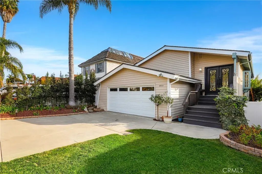 Discover the ultimate SoCal living experience in this upgraded tri-level home featuring five bedrooms, a bonus room, three bathrooms and peek-a-boo ocean views. You are greeted by a large extended driveway, a grassy front yard, entry stairs and a front porch with custom decorative double steel entry doors. Enter your home into a bright, open floor plan adorned with luxury vinyl plank flooring. The living room boasts a large bay window that allows an abundance of natural light to flow through. The custom kitchen is a chef's dream, showcasing professional-grade stainless steel appliances, stunning cabinetry, granite countertops with a mosaic tile backsplash, a pot filler faucet, a garden window over sink, and an eat-at counter. The kitchen is open to a spacious dining room with a large, double pantry and gas fireplace. The dining room also features sliding glass doors leading you to a private deck perfect for indoor/outdoor living. All bedrooms are generously sized with spacious closets and large windows allowing for lots of natural light. The primary bedroom offers a wall-mounted ductless air conditioner, direct access to your own private lanai and an en suite bathroom with a glass enclosure and full body shower . The bi-level private backyard is an entertainer's paradise! It features waterfalls with a pond, grotto-like tropical landscaping, professionally lit hardscape, two decks with peek-a-boo ocean views, an above-ground pool/spa and an exotic palapa/bar. This home is filled with exquisite designer upgrades, owned solar panels with a backup battery system, and recessed l