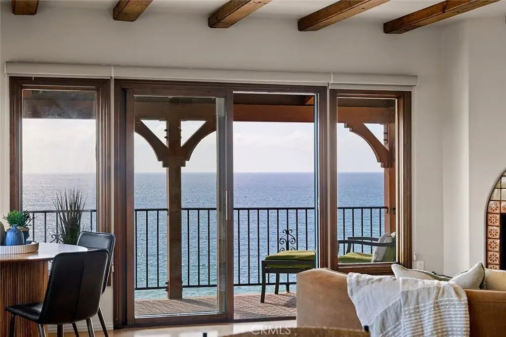 A rare penthouse dwelling within the prestigious oceanfront Casa de Marca, this historic Spanish revival retreat sets the epitome of dreamy coastal living. A very special offering with a public park & the serene CA State Park at State Beach just to the south (both never to be developed), this particular unit offers an incredible living experience unlike any other in the building. A stellar location bar none: top-floor, end-unit spanning street-to-oceanfront with preserved & unobstructed coastline & ocean views from almost every major room within - a truly inimitable characteristic. Sited on a massive oceanfront double lot with sprawling grassy grounds, inside is like a vacation year-round. Whitewater & surfers riding waves just below, Pelicans soaring right by, a crisp emerald horizon, ever-changing sunsets, and preserved coastline rolling toward the world-class surf beyond at Cotton Point, all framed by historic features of the original 1930s estate. This setting evokes a feeling of being somewhere along the Mediterranean coast. Inside, coastal-ocean views immediately steal the show with several divided lite windows & large picture windows out to the emerald ocean. Rustic beamed-ceilings & an arched Spanish-tiled fireplace anchor the main living room. Step out onto the covered lanai overlooking the Pacific to the most beautiful & relaxing setting, very private, elevated high above overlooking the beach below. Featuring rustic wood counter tops with bar seating, stainless appliances, Spanish tile accents & cabinetry, the updated kitchen is wide open to the living room creat