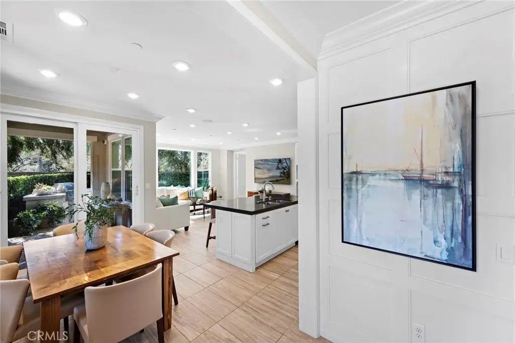 Welcome to this truly special former model home nestled in the serene Village of Esencia in Rancho Mission Viejo. This 55+ residence offers modern elegance with meticulously crafted luxury upgrades including wainscotting, crown moulding, custom built-ins, owned Solar and more. Step inside to discover an inviting open floor plan perfect for a modern lifestyle, with multiple spaces for everyday living and entertaining. Features include the limestone style tile flooring on the first floor and elevated finishes including stately white millwork wainscotting, crown moulding, rich window casings and beautiful glossy white tongue and groove ceilings. The home boasts three spacious bedrooms and three beautifully custom tiled full bathrooms, each with step-in showers and sleek quartz countertops paired with elegant white cabinetry. Rich wainscotting walls, cased windows and elegant ensuite bathroom create a Primary Bedroom sanctuary with additional closet built-ins, overhead recessed lights and frameless glass shower enclosure. A second bedroom is on this level that can be used as an office or guest suite with access to the full hall bathroom with step-in shower and quartz countertops. As you arrive upstairs, note the custom built-in media cabinetry, and surround sound speakers in the generous bonus space highlighted by the laminate floors that complement the sophisticated design. The cased windows highlight the beautiful light filled room and gorgeous hillside views are apparent from every window. This space has multiple uses as a second living room, office or the perfect guest suit