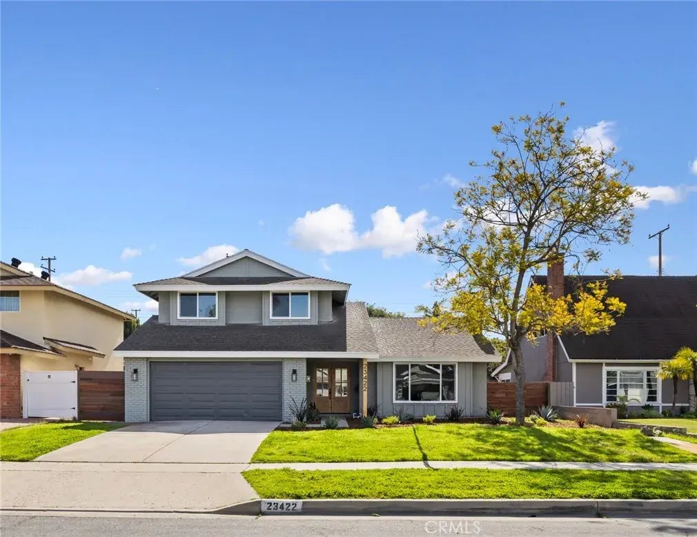 This newly updated, 4 bedroom, 3 bathroom home impresses with its artistic details, main floor bedroom, expansive lot, and extensive updates. Charming solid wood doors open to a bright and cheery main living space with new wide plank laminate flooring, a mid-mod moment near the entry, and a cozy fireplace framed with board and batten detail. Brand new windows throughout the home provide both floors with abundant natural light. The redesigned gourmet kitchen showcases new custom cabinets, sleek quartz countertop, custom backsplash, new stainless-steel appliance package and designer cabinet pulls. Next to the kitchen, the dining space is accented by a statement chandelier. Ideal for entertaining, the kitchen opens to the spacious and private back yard. Rounding out the first floor, a main floor bedroom with full bathroom. Upstairs, three additional bedrooms, one with its own attached bathroom en-suite and walk-in closet. The hall bathroom dazzles with custom details including statement vanity with dual sinks and custom tile work. The oversized backyard includes a concrete area, perfect for outdoor dining, as well as a large grassy lawn. Two-car garage with ample room for storage and direct access into the home. Additional updates include new HVAC, new sliding door, new exterior paint, updated landscaping and new carpet upstairs. Ideally located near fine dining, shopping, transportation, toll roads, golf courses and Orange Countys best beaches.