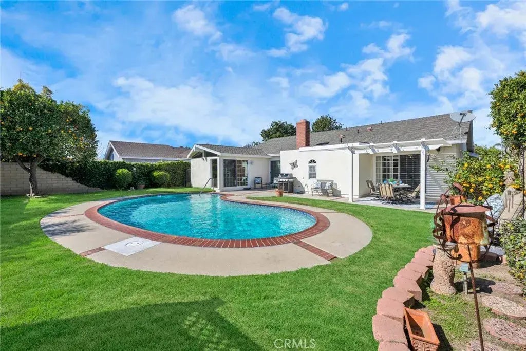 Rare Find! This sprawling ranch-style pool home offers 5 bedrooms, 2 bathrooms, and 2,036 square feet of single-level living with no interior steps, beautifully upgraded and meticulously maintained. Nestled on a 7,320 square-foot interior lot in a sought-after neighborhood within a top-ranked school zone, this exceptional home boasts dual-pane French-style windows and sliders, plantation shutters, engineered wood plank flooring, crown molding, ceiling fans, and a chefs dream kitchenremodeled and expanded with tile flooring, a coffered ceiling with recessed lighting, granite countertops, a travertine-style tile backsplash, solid Cherrywood custom cabinetry with brushed nickel hardware, pull-outs, hidden recycle trash, a Lazy Susan, a pantry, a built-in wine/coffee station, an eat-in breakfast nook, stainless steel appliances (5-burner gas range, microwave, dishwasher), and a wide peninsula with additional cabinets and shelving that seamlessly connects to the banquet-size formal dining room. Step through double entry doors with beveled glass into a tiled foyer and an elegant living room featuring a fireplace with a raised hearth, mosaic tile surround, and white wood mantel. The Hawaiian-style family room is a dream, showcasing a cathedral ceiling, walls of glass, high transom windows for abundant natural light, tile flooring, and beach-style wood siding, evoking a resort-like ambianceespecially when you slide open the doors to reveal a tranquil backyard paradise with a sparkling pool, lawn, brick-accented deck, covered patio, and block wall fencing. The primary suite, with it
