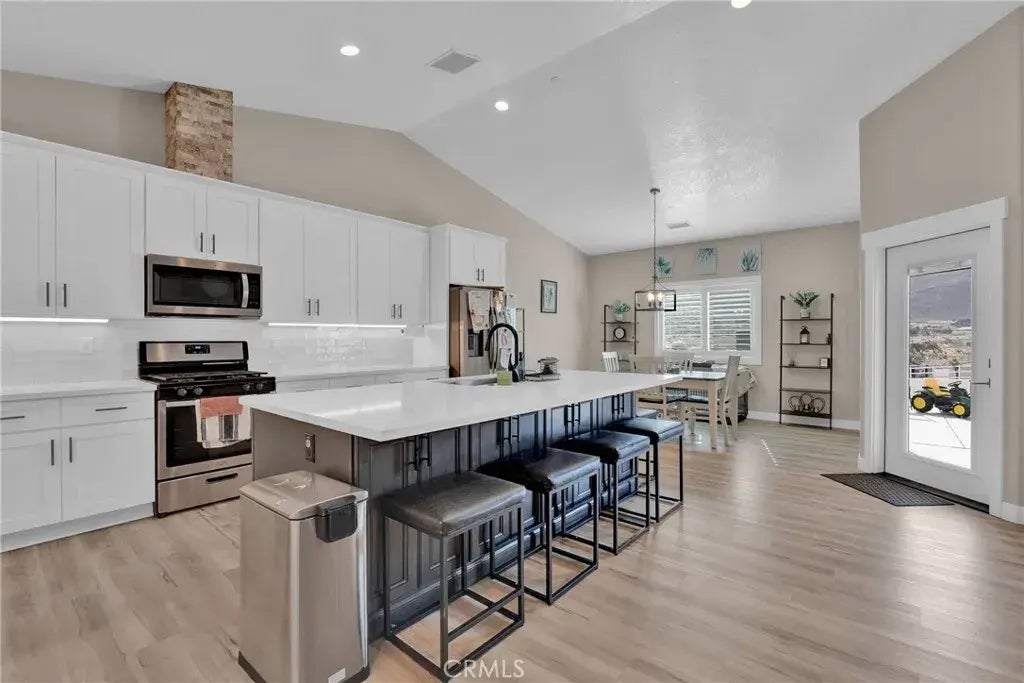 Welcome to 22445 Pacific Street, a beautifully crafted single-story custom home in the desirable City of Apple Valley. Built in 2022, this custom residence is set on a sprawling 2.27-acre lot, offering stunning desert vistas and newly landscaped grounds. Inside, you'll find a spacious and modern layout with 2,430 square feet of living space. The home features four well-appointed bedrooms and two and a half bathrooms, all enhanced by abundant natural light from oversized windows and solid doors. The open-concept kitchen is a chef's dream, complete with custom cabinetry, a large island topped with quartz countertops, and a chic subway tile backsplash. Stainless steel appliances, including a gas range and oven, complement the space, along with a convenient walk-in pantry. The kitchen flows effortlessly into the living room, where tall vaulted ceilings and a cozy fireplace set against a stone veneer wall create a welcoming atmosphere. The master suite offers a serene escape with a luxurious bathroom featuring a walk-in shower, double sinks, and a spacious walk-in closet. Energy-efficient windows enhance comfort throughout the home. Outside, enjoy the convenience of a three-car garage and ample driveway space, perfect for parking vehicles, boats, or an RV. The backyard is a blank slate ready for your imagination. This home also includes a washer/dryer hook ups in-unit, air conditioning, and solar panels, ensuring both comfort and sustainability. Experience the perfect blend of modern living and natural beauty in this exceptional Apple Valley home.