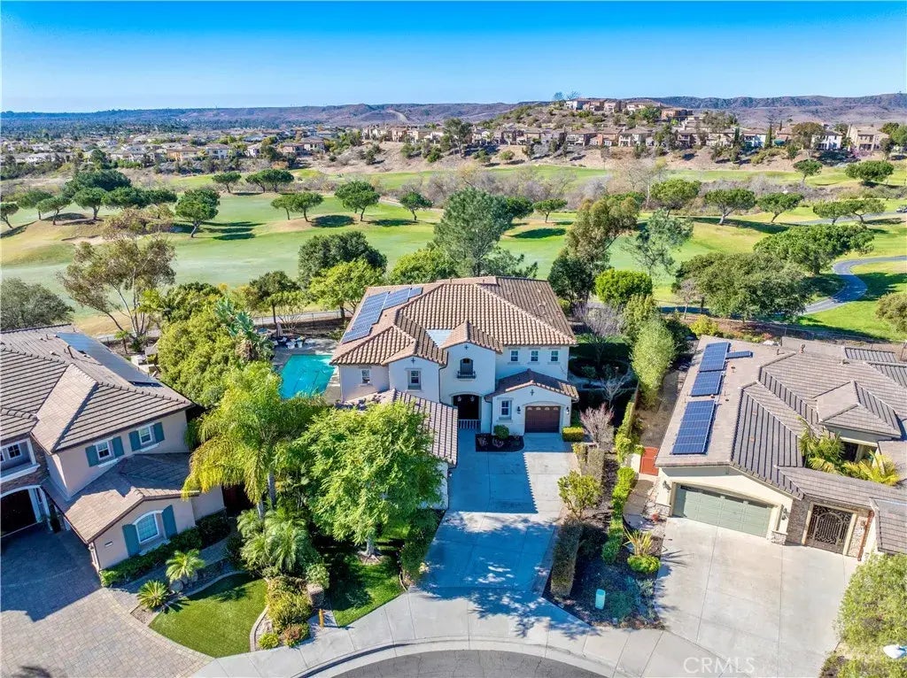 Welcome to your paradise home! This luxurious Toll Brothers residence, built in 2013, features 5 bedrooms and 4.5 bathrooms plus an office that can be converted to the 6th bedroom easily, offering breathtaking views of the golf course and the rolling hills of Oceanside. As you step through the front doors, youll be greeted by soaring 19-foot ceilings, a grand dual staircase, and an elegant chandelier, exuding sophistication and charm. The first floor includes a private office and a bedroom with an en-suite bathroom for added convenience. The gourmet kitchen is designed for culinary enthusiasts, boasting top-of-the-line stainless steel appliances and an oversized granite islandperfect for gatherings and holiday feasts. The living room seamlessly extends to the backyard through a bi-fold door system, creating a harmonious indoor-outdoor living experience. The exquisite master suite features a private balcony overlooking multiple holes of the Arrowood Golf Club, offering stunning sunset views. Situated on a 2.58 acre lot, the backyard is an entertainers dream, complete with lush landscaping, a saltwater pool, and a spa. Additionally, the property provides direct access to the golf course from the 10th fairway. This home is equipped with owner-owned solar panels and is less than 10 miles from the beach and downtown Oceanside, where youll find a variety of restaurants, bars, and entertainment options. Additional highlights include tile flooring, detailed crown molding, soaring ceilings, a luxurious kitchen, and more. A true blend of elegance, comfort, and entertainment!