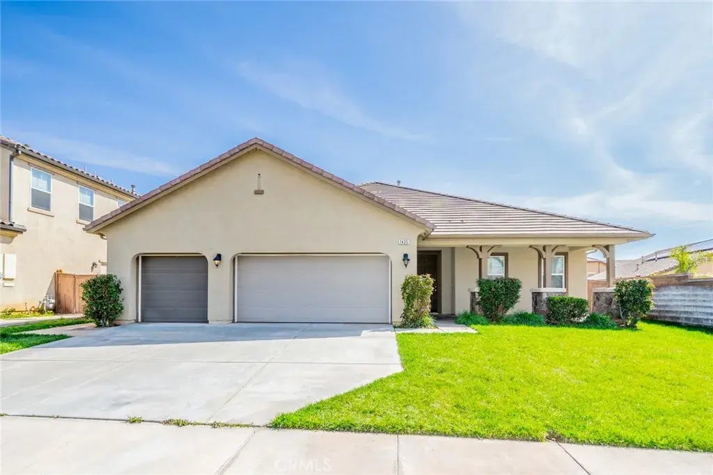 Welcome to this spacious single-story Sundance community home on a cul-de-sac and offers 3 bedrooms, 2 baths, and 2,228 sq ft of living space. You are greeted with a covered front patio. The open floor plan features high ceilings, a front-facing bonus room, a large kitchen with a sit-up counter, abundant cabinets, two pantries, and adjacent to a large family room with fireplace, media niche, and slider to the backyard. Split floorplan with one wing having the primary bedroom and an en-suite bath with a convenient linen closet, dual sinks, separate tub, walk-in shower, and large walk-in closet. The other wing has 2 very spacious bedrooms with mirrored closet doors separated by the secondary bathroom with dual sinks and tub/shower combo. Beautiful matching tile and laminate wood flooring throughout. No carpet. Separate laundry room and three-car direct access garage. Updates include NEW interior paint. Close to many parks, schools, shopping centers, and commuter friendly with easy access to the 10 & 60 freeways.