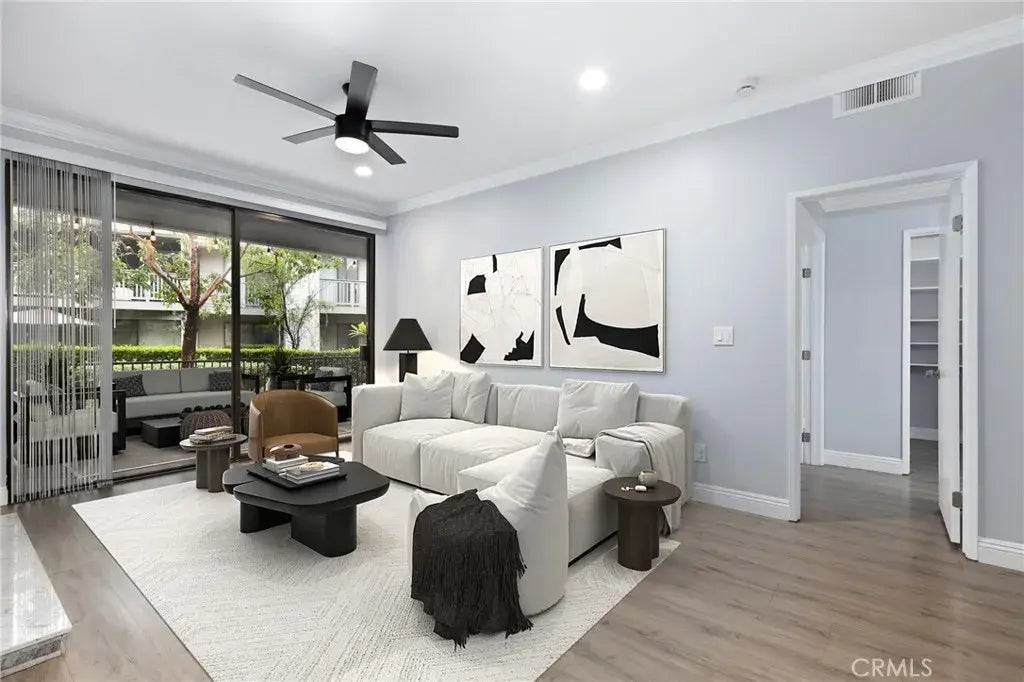 Stunning Ground-Level One-Bedroom Condo in a Gated Lakeside Community! Step into this beautifully updated single-level condo featuring an open and airy layout. The spacious living area boasts recessed lighting, crown molding, a ceiling fan, and a modern fireplace, creating a warm and inviting atmosphere. Sliding glass doors fill the space with natural light and lead to a private patio with serene creek views. The stylish kitchen, open to the dining area, showcases an eat-in bar, sparkling stainless steel appliances, and a chic backsplash. A ceiling fan in the dining area adds extra comfort. The generously sized bedroom also offers patio access, providing a retreat with picturesque views. The ensuite bathroom features a large vanity and a shower-in-tub combo. Enjoy the convenience of an in-unit laundry area discreetly tucked away in a patio closet. This ground-level home is surrounded by lush landscaping, including beautiful plumeria. Nestled in the sought-after Lakeside Gated Community, residents enjoy resort-style amenities, including a sparkling pool and spa, as well as the beauty of peaceful creeks. Ideally located near Greenfield Sports Park. Dont miss this opportunityschedule your showing today!