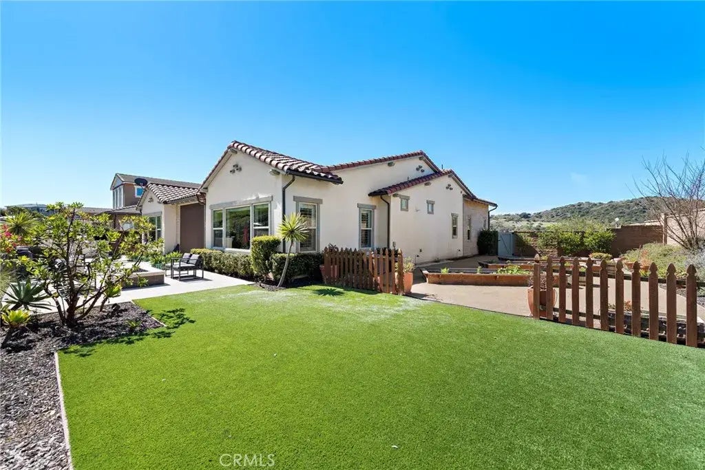 A rare 10,000+ square-foot lot at the end of a quiet cul-de-sac located in the highly-coveted 55+ neighborhood of Esencia in Rancho Mission Viejo. This beautifully designed single-level home enjoys abundant natural light with no neighbor on one side and soaring 10-foot ceilings. You'll love the floor plan and design that includes 2 primary ensuite bedrooms, 3 baths & office overlooking the front porch. The heart of the home is the spacious open-concept living area where two walls of panoramic sliding doors disappear, blending indoor and outdoor spaces in the best way possible. The chef's kitchen with ample storage, walk-in pantry, built-in wine fridge, gas stove, tasteful finishes & dramatic chandelier centers around a large center island. Entertain seamlessly with the indoor-outdoor living space offered by the covered California room with motorized privacy sun shade, outdoor TV hook-up and space to gather or watch TV outside. The backyard layout is a dream with so many conversation areas: the built-in BBQ island with seating, the modern fire pit sitting area with water feature, a large artificial grass yard, plus the adorable picket-fenced-in garden with 3 garden boxes, irrigation system and space for your imagination to grow. The primary suite includes two vanities, soaking tub, walk-in closet and lovely glass-door shower. Guests will love the second bedroom that feels like its own retreat with ensuite bathroom and walk-in closet. Enjoy the plethora of amenities as a resident of Rancho Mission Viejo from parks, pools and clubhouses. As a "Gavilan 55+" resident, you'll hav