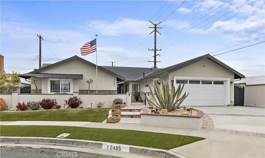 Stunning Single-Story Home on a Cul-de-Sac w/ Pool & Spa. This sprawling single-story home also has an in tract elementary school. A beautifully curved driveway w/ brick ribbon accents leads to the front gated courtyard, surrounded by artificial grass and a charming succulent garden. Step inside through the grand entryway with leaded glass inlays & side lights, where you'll be greeted by wood-look wide plank tile flooring, bullnose corners, high baseboards, and custom crown molding throughout. This smart home features recessed lighting, dual-pane windows, A/C with a whole-house fan, and keyless entry for all exterior doors & gates. The chefs gourmet kitchen is a dream, boasting quartz countertops, a designer marble backsplash extending to the ceiling, custom cabinetry w/ large drawers & pull-outs, high-end stainless steel appliancesincluding a Thermador gas cooktop, Zephyr disappearing range hood w/ remote, gas oven, micro/convection combo, KitchenAid DW, and a Blanco farmhouse sink w/ a custom grate. A spacious breakfast bar provides additional seating and the open-concept living areas include a cozy family room & a living room w/ a stacked stone fireplace & glass doors leading to the backyard oasis. The primary suite offers a peaceful retreat w/ a custom wood window ledge, crown molding, center ceiling fan/light combo, walk-in closet w/ an organizer, and a private ensuite bath featuring a spacious walk-in shower w/ tile surround & a frameless glass door. The generous guest bedrooms all include crown molding, ceiling fan/light combos, and mirrored wardrobes. One bedroom is