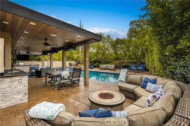 This is the one you've been waiting for THE CROWN JEWEL OF FOOTHILL RANCH! Experience the exceptional luxury of this one-of-a-kind property with an expansive backyard oasis reminiscent of a 5-star resort. This newly remodeled masterpiece blends sophistication and exquisite architectural design, tailored for the discerning buyer. Featuring five en-suite bedrooms, 5.5 bathrooms, two fireplaces, and 4,000 sq. ft. of elegance and luxury. This entertainer's dream home welcomes you with a grand entrance into the formal living room, warmed by a fireplace and highlighted by a sweeping staircase. Custom-tiled flooring flows seamlessly through the open spaces, leading into the heart of the home your dream kitchen. Top-of-the-line appliances include a Wolf dual-range six-burner stove, convection oven, Wolf Pro wall-vented hood, Wolf convection steam oven, Frigidaire Professional refrigerator, Bosch Silence dishwasher, and an in-wall pot filler. These complement the oversized island with seating. Quartz countertops, a custom glass backsplash, and a walk-in pantry complete this culinary haven. The family room and dining area embrace the open-concept floor plan, enhanced by expansive folding glass doors that seamlessly connect the indoor and outdoor living spaces. Guests will appreciate the downstairs en-suite bedroom, while the separate dedicated office offers serene views of the beautiful backyard. The primary suite with a retreat boasts a two-sided fireplace, a remodeled bath with separate vanities, a soaking tub, a custom spa shower with multiple shower heads, and a large walk-in c