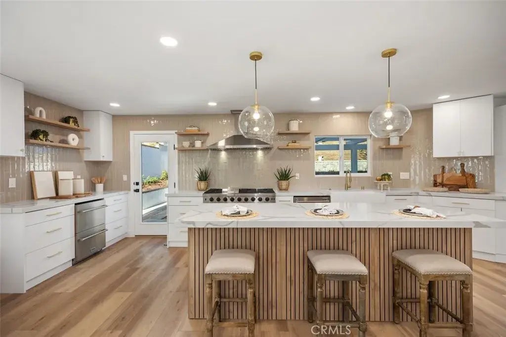 Welcome to this exquisite, fully remodeled luxury home nestled on a cul-de-sac in the serene neighborhood of Stratford Ridge in the heart of Laguna Hills. Pictures do not do this home justice! This stunning six-bedroom (all bedrooms have closets!), three-and one-half bathroom residence masterfully combines casual elegance with modern design. Upon entering, you'll be greeted by the soaring two story ceilings and a spacious open-concept layout that exudes both comfort and style. The living and family rooms are adorned with custom fireplaces, creating a cozy ambiance throughout your main floor living spaces. The chefs kitchen is truly the heart of the home, featuring pristine white cabinets, opulent quartz countertops, and a sprawling island perfect for both everyday living and entertaining. It also includes a newly constructed hot and cold beverage bar with easy access to cold drawers for entertaining. The main floor also features an oversized bedroom and full bath with shower along with individual laundry room and additional powder room for guests. Upstairs the oversized primary suite is a sanctuary all its own. Boasting a cozy fireplace, walk-in and secondary closets, as well as a lavish, custom tiled shower, soaking tub, and private water closet in a bathroom that offers a serene retreat with high-end finishes in an immense space. Each detail has been meticulously crafted to ensure a blend of functionality and luxury. Abundant natural light fills the home, enhancing the beauty of the dual-pane windows and highlighting the refined design throughout. Direct access to your sp