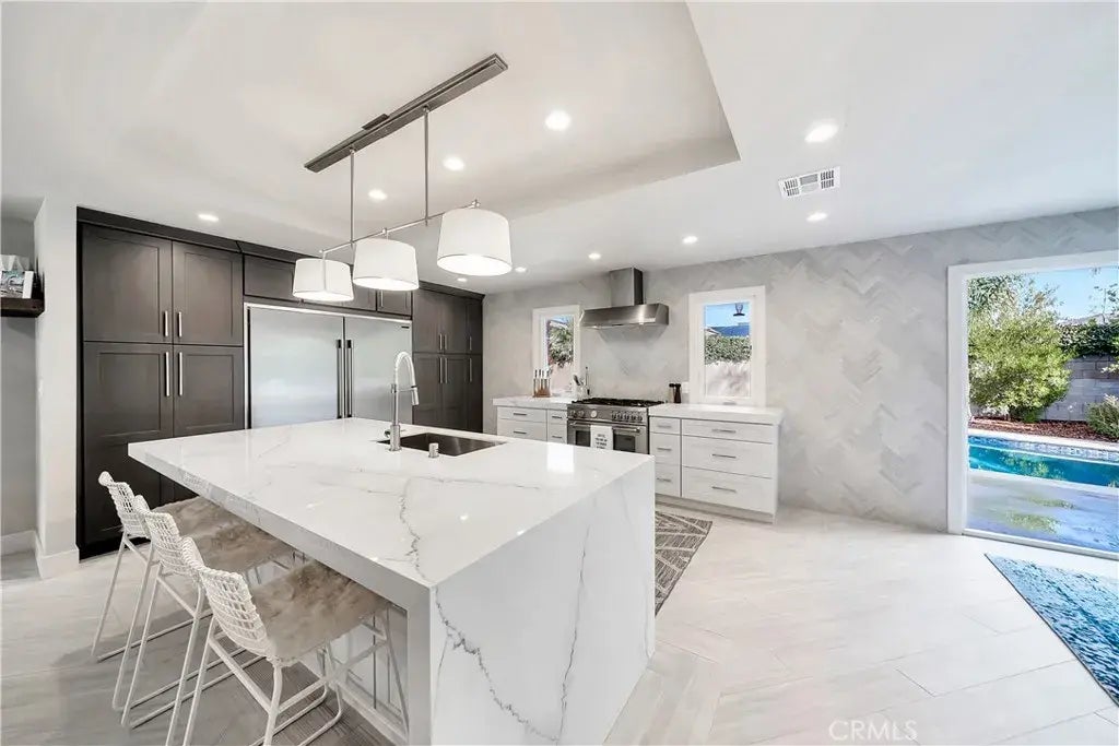 Meticulously updated single-level mid-century modern in a desirable East Costa Mesa location. Just steps to the Back Bay or local spots on 17th street. Enjoy effortless indoor-outdoor living with your own backyard oasis pool. The heart of the home features a modern, updated, open-concept kitchen with beautiful waterfall quartz counters over an expansive eat-in island. You will also find built-in stainless-steel appliances, wall-to-wall stone backsplash, and stunning cabinetry with views of the living room and family room featuring a handsome stone fireplace. The primary suit offers dual walk-in closets with built-in organizers. Both bathrooms have luxury upgrades with designer stone and tile. All appliances stay with the home. The owner pays for weekly gardening and pool service. Don't miss the opportunity to live in this retreat in the heart of it all.