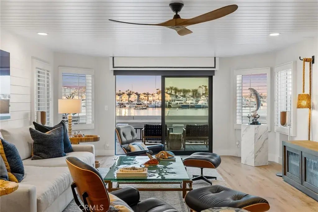 Discover a rare opportunity to own a designer-quality home with unparalleled views at 1819 West Bay Avenue, Unit A, Newport Beach, CA. Situated in a prime "front row" location, directly across from Mother's Beach, this residence offers breathtaking vistas of the sparkling Newport Harbor, city lights, and the renowned Christmas Boat Parade. This fully remodeled waterfront condo showcases exquisite craftsmanship and sophistication. The welcoming raised front patio is perfect for al fresco dining and entertaining, leading to a private entry adorned with a custom Dutch door. Inside, the sunlit great room features an open-concept design, highlighted by White Oak wide plank flooring, LED recessed lighting, a custom two-sided stone fireplace, automatic roller shades, and plantation shutters. The kitchen, a chefs paradise, is outfitted with custom cabinetry, quartz countertops, a tile backsplash, Thermador appliances, and a Sub-Zero refrigerator and freezer. The Blanco kitchen sink and Perrin & Rowe faucets and dispensers add a touch of luxury. Adjacent to the kitchen, the elegant dining area boasts a custom-built bar, Sub-Zero wine refrigerator, and marble slab countertop. The ground-level bathroom is elegantly upgraded with a custom vanity and countertop, a hammered metal sink, and designer wallpaper. Beyond the kitchen, a private rear entertaining area invites relaxation, featuring a fire element, flagstone, bistro lighting, and expertly crafted softscape. Ascend to the luxurious primary suite, which dazzles with custom built-in cabinetry, a shiplap accent wall, a remote-control