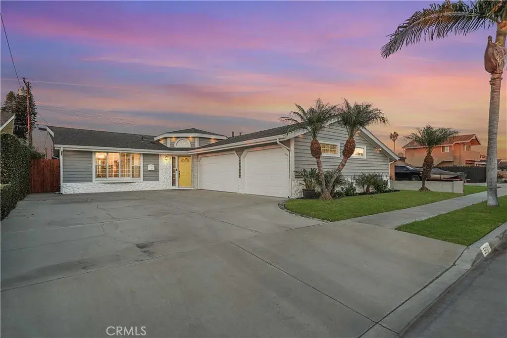 Nestled in a prime interior location on a serene, single-loaded street overlooking a lush green field, this exceptional family home offers nearly 2,100 square feet of single-level living space with an oversized attached three-car garage. Thoughtfully upgraded inside and out, the home boasts refinished hardwood flooring, vaulted ceilings, stylish shiplap accents, custom window coverings, recessed lighting, ceiling fans, and French doors. Modern comforts include a new A/C system, a whole-house fan, a water softener, a tankless water heater, and ample storage. Designed with an open-concept layout, the spacious great room features a cozy fireplace, while the beautifully updated kitchen showcases brand-new countertops, upgraded cabinetry and hardware, a convenient pass-through breakfast bar, a built-in writing desk, and high-end stainless steel appliances. Direct access from the oversized 3 car garage to the kitchen adds ease to daily living. The private primary suite impresses with soaring ceilings, French doors leading to the backyard, a massive walk-in closet, and a spa-like en-suite bathcompletely remodeled with dual sinks, a luxurious soaking tub, and a separate walk-in shower. Generously sized secondary bedrooms include one with its own fully remodeled en-suite bathroom. The low-maintenance backyard is an entertainers dream, featuring high-quality turf, upgraded hardscaping, a large storage shed, and mature landscaping for added privacy. The expansive driveway provides ample parking space, including room for a boat or RV, with additional storage sheds in the side yard. Enj
