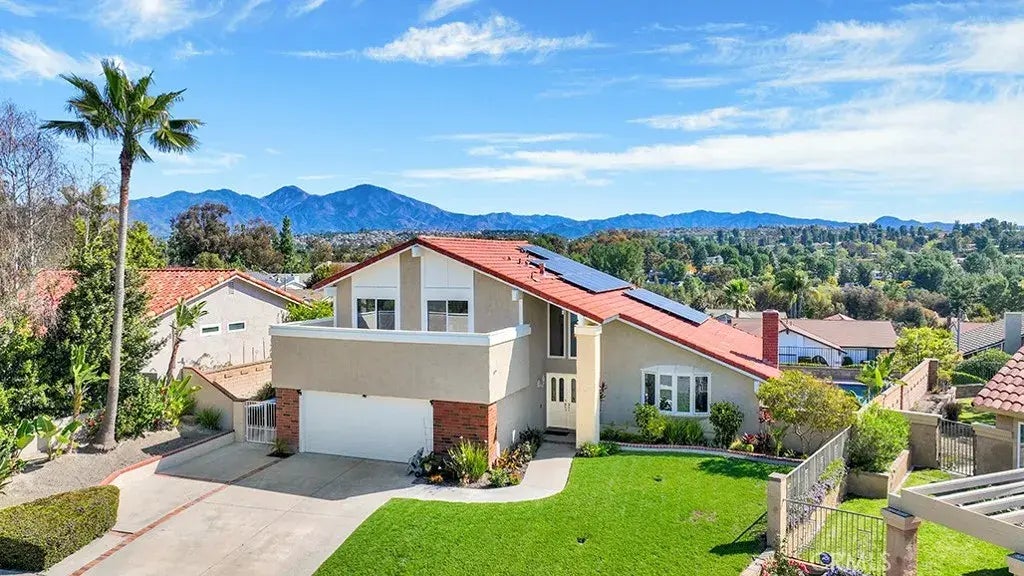 Welcome to this well appointed view home with 4 bedrooms, 3 baths & 2,150 square feet of living space. Located on a serene, single loaded street in the coveted Madrid community, the home is positioned to capture panoramic Saddleback mountain, tree and city lights views. These sights may be enjoyed from the kitchen sink, in kitchen dining area, formal dining area, family room, primary bedroom, upstairs deck or the private backyard's grass or hardscape areas & pool. This location is not one to be passed up! The home is situated on a spacious pie shaped lot that spans 7,600 square feet, is well landscaped, has mature lemon, orange & Haas avocado trees, a saltwater pebble-tech pool that was resurfaced in 2022 & owned solar panels. Upon arrival you'll notice a spacious driveway, manicured lawn & a home's exterior that has been well maintained. Enter through the front double doors to the living room's cathedral wood beamed ceiling, freshly painted walls, a cozy fire place and a preview of the mountain view seen through the kitchen area's sliding glass door. The kitchen comes appointed with a stainless steel convection double oven, electric cooktop, solid surface countertops, with space to eat at the counter while someone else cooks, an under-mount dual-basin sink with a view that includes the pool, plenty of storage and another eating area. The sliding door off the kitchen leads to a concrete patio area that accommodates a table and 6 chairs perfect for al-fresco dining. Adjacent to the kitchen is the family room with another fireplace. A bedroom and bathroom with no interior ste