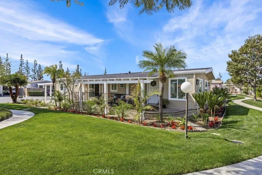 Senior Park Community 55+...This home is newly remodeled, new dual paned windows, new energy efficient appliances, freshly painted inside and out, patio desk has been recoated and painted, new railing on front porch, newly landscaped, side by side parking and has been leveled. This home is at the end of a cul-de-sac, lake view from front porch. Front of home faces lush greenbelt. Quiet neighborhood. This home will sell fast. Call for appt. Near restaurants, 57 freeway, shopping and bus stop in front of park. This home is a must see!