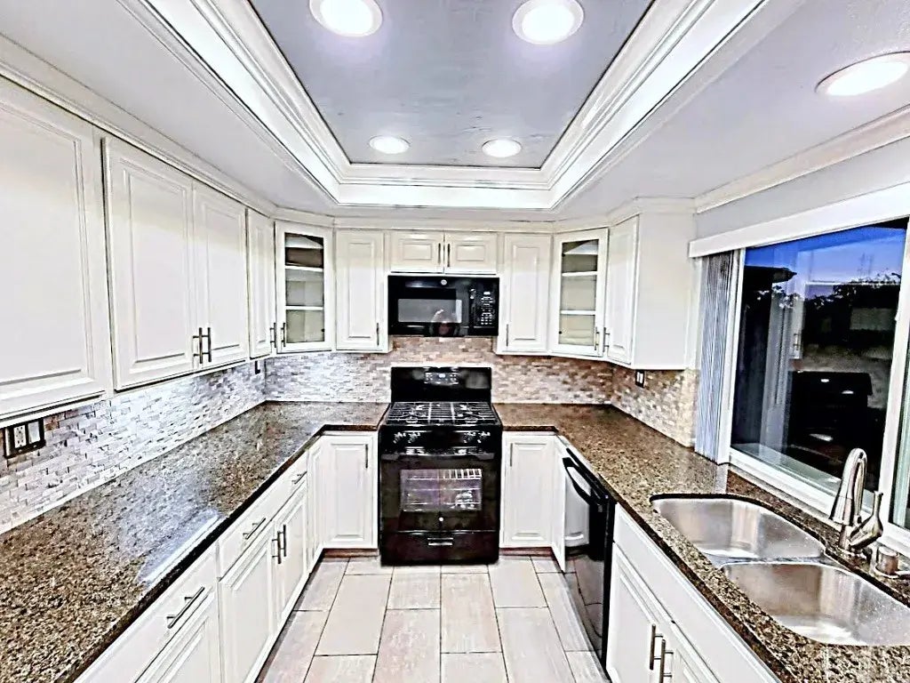 Prime section of Golf Course location! Gorgeous Spectacular SUNSET-Panoramic View at your private FULL-LENGTH Patio! Luxuriously Remodeled, Complete Modern Extensive Upgrades from pristine sahara sand porcelain floor tiles , waterproof vinyl wood plank to crown molding & Skylite! Recently RE-PIPED! NEW FRESH EPOXY COATED GARAGE Flooring. Exclusive private circular CulDeSac with only 4 homes, no one in front/at your back! Views in Kitchen-Dining-Living room. Spacious welcoming front porch with porcelain tiles flooring & solar led lights fixtures. Beautiful custom white-grey ledgestone fireplace in living room. Coffered Ceiling-Led recessed lights in kitchen with gorgeous high-end Granite counters, self-closing white shakers cabinets, Led-underlighting hardwired system, Microwave/Refrigerator/Washer-Dryer/Dishwasher/4 Gas burner stove-Oven Range/stainless dual sink. Newer updated HVAC system. Tubular Skylights illuminates on Living Room/Master Shower. Double French-doors with custom sidelights. Dual Pane windows/slider glass doors. Vertical blinds & curtains. Master Bathroom features dual vanity, high quality Carrara silver-grey Hexagon Mosaic tiles flooring complete with new modern linear shower drain system. Brand New shower over tub remodeled common bathrooms! Smooth high Ceilings, Led Recessed Lights, heavy duty stainless hardware, Updated electrical system - HVAC. . Lighted Ceiling Fans in Bedrooms, Recreation Center offers heated Pool/Spa/Library/Gym/Tennis /Golf/ Pickleballs/Table Tennis/Shuffleboard/ Water-exercise/Art workshop /Lawn Bowling/Variety Shows/Dinner Dance