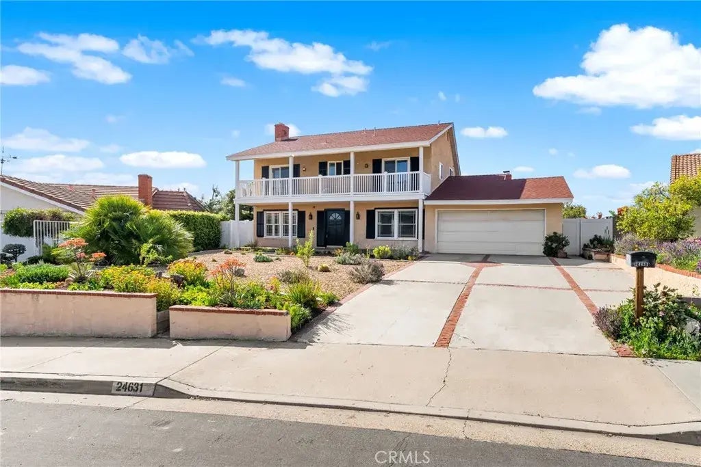 Nestled on a peaceful cul-de-sac lies 24631 Catalonia Circle. This spacious 2-story home spans approximately 2300 square feet. It offers five bedrooms (one of which is on the main floor) and three bathrooms ready for a fresh vision and full of potential - providing a fantastic opportunity to create your dream home while enjoying expansive views of Saddleback Mountain and South Orange County. From the moment you arrive, you're welcomed by a spacious, eco-friendly front yard and a charming full-length balcony with classic shutters and updated sliders. Step inside to discover brand new carpet and fresh paintthen step out back to a wraparound yard bursting with colorful foliage and timeless charm and views. The main floor features a bedroom and a full bathroom alongside a living room, family room, dining room, and kitchen. The living and dining rooms boast large windows and sliders to delightfully bring the outside in. Upstairs has four additional bedrooms that offer plenty of space and can easily be made into a home office, game room, or whatever your heart desires, with large windows that flood the rooms with natural light and showcase the stunning surrounding views. The home features fireplaces in both the living and family rooms, adding warmth and character. It has been repiped with PEX, and has a new washer and dryer. Residents of this community enjoy their neighbors friendliness and optional access to Lake Mission Viejo and a community pool for a small HOA fee. Additionally, the property is conveniently located just two stoplights off La Paz - near numerous local parks, s