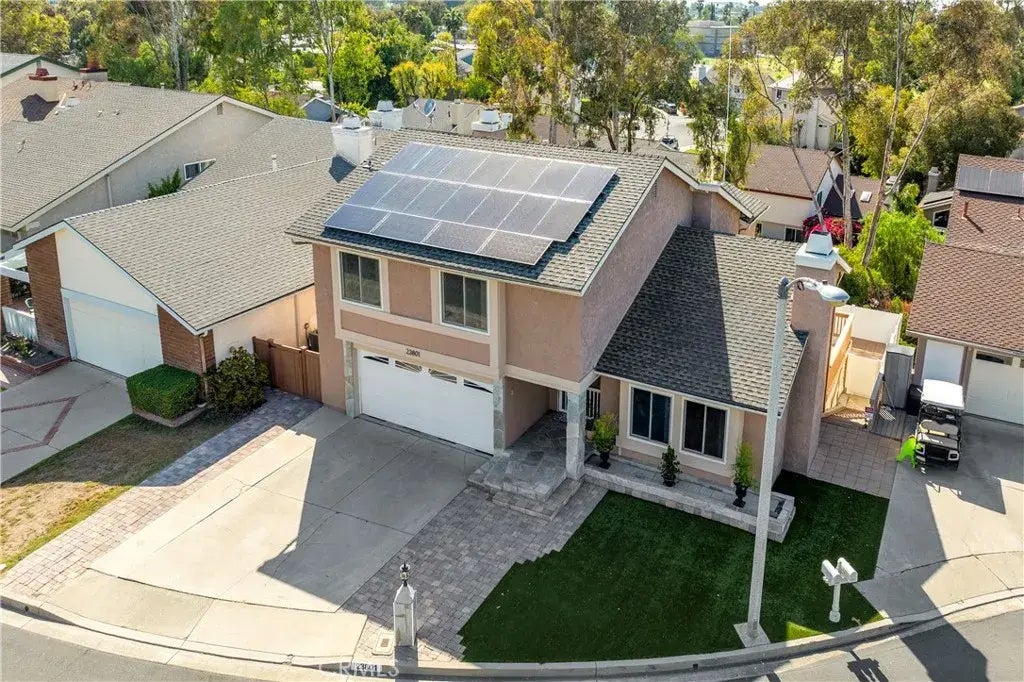 Beautiful multi-level home in Mission Viejo's picturesque Timberline Community featuring a brand-new roof professionally installed for durability and peace of mind. The new roof not only enhances the homes curb appeal but also provides energy efficiency and weather protection for years to comean exceptional upgrade that adds real value and confidence to your investment. This functional floor plan includes a formal dining room, family room, living room, two fireplaces, and vaulted ceilings. Enjoy a master bedroom with a large retreat, walk-in closet, skylights, and dual sinks. Inside, discover marble, tile, and hardwood flooring, custom lighting, ceiling fans in all the bedrooms, a house fan, and matching vertical blinds throughout. Upgrades feature owned solar panels, top of the line Andersen windows, a two-year-old tankless water heater, five-year-old HVAC system, soft water and reverse osmosis systems, a home security system with cameras ($40/mo.), a 220 connection for electric vehicles, and a closed-in trash area with vinyl fencing. The property boasts artificial turf, pavers, and rain gutters with underground pipes. The backyard spans 2,280 sq. ft., the largest yard in the community, with an extended deck and stairs, plus a shed underneath, creating zero-maintenance front and backyards. The garage includes extensive storage, checkered flooring, washer and dryer. Enjoy the view and privacy from the house that is located at the top of the hill, on a cul-de-sac, making it perfect for a traffic free environment and is close to the 5 FWY, shopping, and schools.