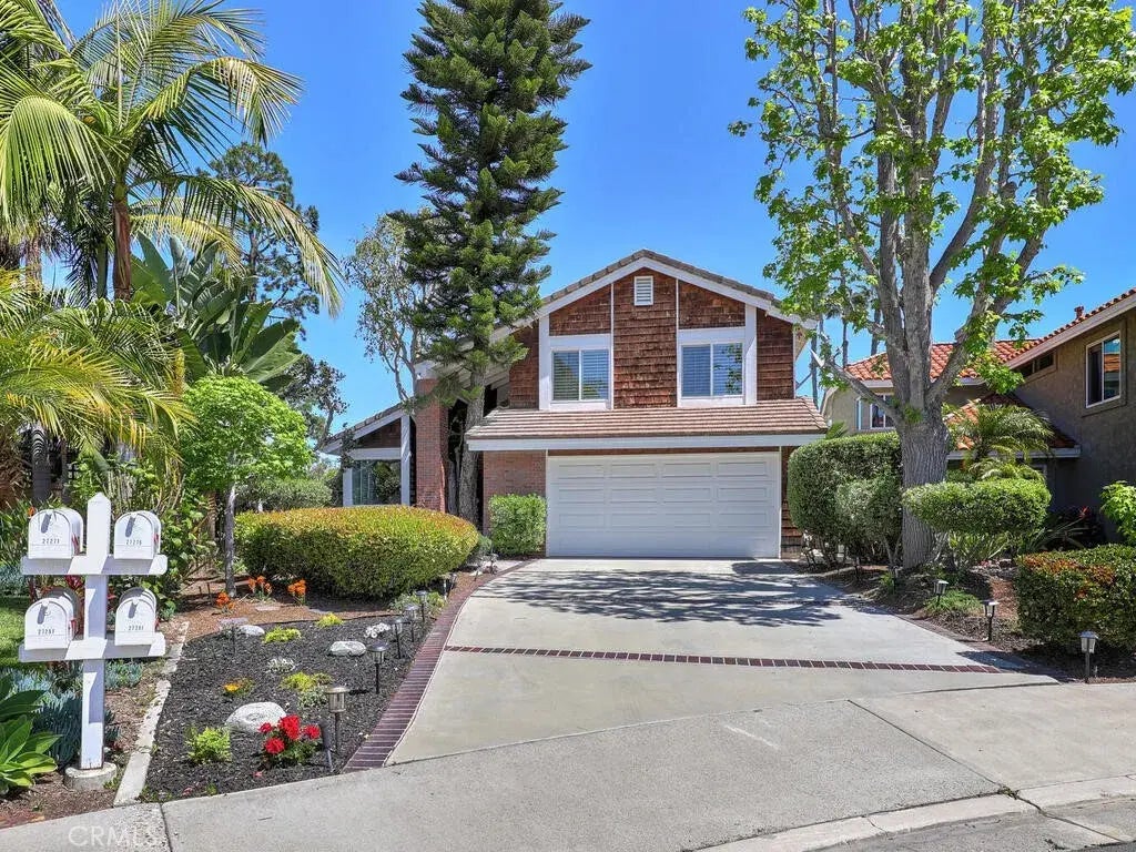 Tucked away at the end of a peaceful single-loaded cul-de-sac in South Mission Viejo, this inviting home offers a perfect blend of comfort, style, and privacy. With 3 bedrooms, 2.5 baths, and a versatile office nook at the top of the stairs, the floor plan is both functional and flexible. The entry level features a spacious living room with a charming window seat that frames serene views of mature trees and the greenbelt across the street. Steps down lead to a formal dining room and casual living space, where the white kitchen opens to a cozy family room complete with built-in bookshelves and a brick fireplace. The kitchen features updated cabinetry, granite countertops, a pantry, and a breakfast nook with seating beside a sunny bay window. A large kitchen sink looks out to the sparkling pool and spa and lush backyard views. Laminate wood flooring runs throughout the downstairs living areas, complemented by neutral decor and abundant natural light. Most of the windows have been updated, adding to the home's energy efficiency and modern feel. Upstairs, the primary suite offers a private retreat with its own brick fireplace, a walk-in closet plus an additional closet, and a large en-suite bath with a double sink vanity. A small private balcony off the primary suite provides expansive, panoramic views. The backyard includes a pool, patio, and large side yard ideal for gardening. No homes directly behind. Long driveway, garage with storage, full repipe. Includes Lake Mission Viejo membership with beaches, boating, concerts, camps and more.