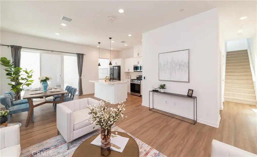 GATED COMMUNITY! AMAZING COMMUNITY AMENITIES! Step into modern luxury with this breathtaking 3-bedroom, 2.5-bathroom home, set on a spacious prime end-unit lot. This stunning property was well taken care of and it offers the perfect combination of style, comfort, and functionality. As you enter, you're greeted by sleek luxury vinyl flooring that flows effortlessly, creating a seamless flow and natural lighting all throughout the home. The chef-inspired kitchen is a true highlight, with gleaming white quartz countertops, custom white shaker cabinets, and a striking tiled backsplash. The expansive kitchen island offers both ample prep space and additional storage. A refrigerator, stackable washer and dryer add convenience and efficiency. The master suite is a tranquil retreat, complete with a walk-in shower, dual sinks, a spacious walk-in closet, and a private toilet room for added privacy. Outside, a beautifully landscaped backyard awaits, along with a thoughtfully designed side yard featuring turf and concrete areas, ideal for both relaxation and entertaining. Additional standout features include a Tesla charging port and a Brilliant Smart Home Control System. HOA amenities includes a fully equipped gym to an Olympic-sized pool, spa, dog parks, BBQ grill, fire pits, showers, full bathrooms, quiet room for work, an event hall, electric charging stations, and more. (photos include furniture staging, home is unfurnished)