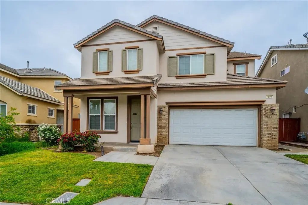 Welcome to the highly desired community of The Villages of Avalon. This home features 4 bedrooms, 2.5 baths, and 2,313 sq ft of living space with a 3-car tandem garage. You are welcomed from a covered front porch and upon entry greeted by the living room/dining room combo with a 2-story ceiling and lots of high windows to bring in the natural light. The family room has a fireplace and media niche that flows into the kitchen with an island, recessed lights, laminate flooring, a walk-in pantry, and abundant cabinetry. The second floor has all 4 bedrooms, 2 baths, and a convenient laundry room. The Primary bedroom faces the backyard with mountain views, has an ensuite bath with dual sinks and a vanity area in between, a separate tub, a walk-in shower, and a walk-in closet. Two secondary bedrooms share a bathroom with a shower/tub combo. Laminate flooring on the first floor in the hallway, living room, dining room, kitchen, and half bath. Large pool size backyard. The affordable HOA amenities include a pool, spa, tennis courts, BBQ area, and a playgrounda convenient location, close to 215 FWY and right across from the Perris Fairgrounds.
