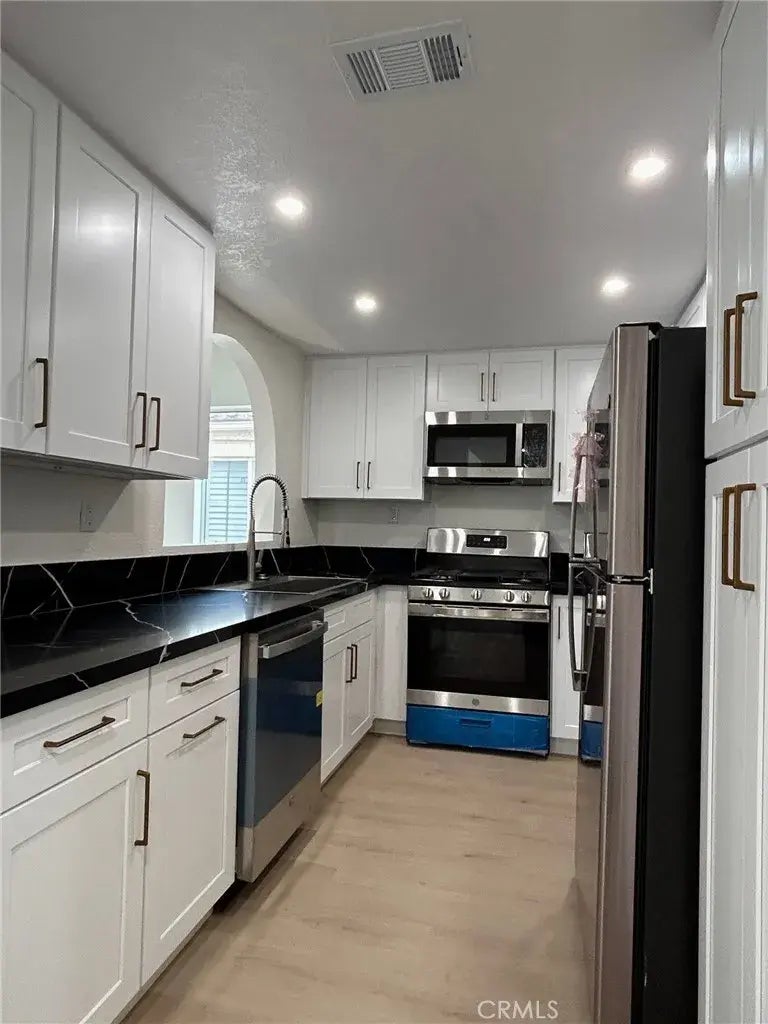 Welcome home to this stylishly REMODELED 2nd floor, 2 bed / 2 bath END-UNIT condo with large, 2 CAR DIRECT-ACCESS GARAGE below. Enjoy cooking in the NEW KITCHEN with quartz counters & ALL stainless appliances. The SPACIOUS Living room / Dining room offers lots of natural light & opens to a PRIVATE balcony. New LVP flooring throughout incl. in both bedrooms & UPDATED BATHS. Primary bedroom features en-suite bath & huge walk-in closet. Washer & Dryer hook-up located in the roomy garage. Sewer, Trash & Water included in rent. Vista Del Flores condo community has an HOA pool & spa area & is ideally located near shopping, dining, entertainment & outdoor activities with easy access to I-5 & near-by toll roads.
