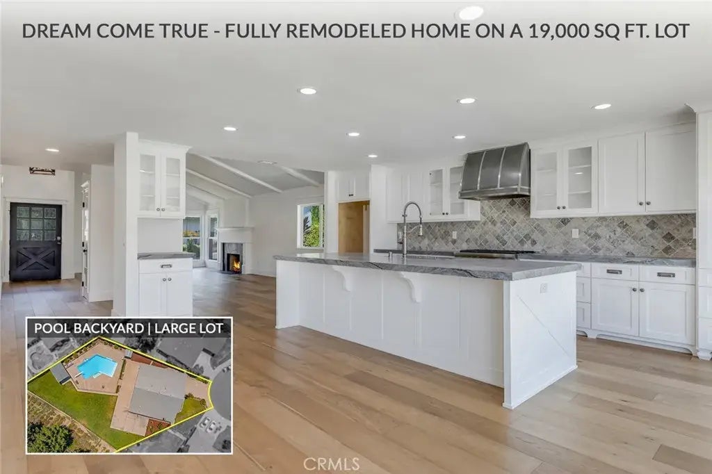 TRULY A DREAM HOME FULLY REMODELED 2,250 sq. ft. HOME on a HUGE LOT - APPROX. 19,000 SQ. FT. 4 Bedrooms, 2 bathrooms This home has been fully remodeled... and done right with high quality materials! Its like a brand-new home. The incredibly large and well-maintained backyard makes you feel like youre at a resort really! The Kitchen is very open light and bright - with Brazilian quartzite counters, Thermador stainless steel appliances, custom designed zinc stove hood, custom shaker cabinets with quality bronze designer hardware - soft close drawers and a pantry with shelves and pullout drawers. You'll love the roomy bathrooms with travertine tile and designer exposed pipe rain showerheads, vanities with soft-close doors and drawers. The bedrooms are all spacious and light. The master bedroom has a walk-in closet with built-in closet organizers. The flooring is rich hardwood throughout, except in the bathrooms and laundry room, where its Travertine tile. Other features include brand-new dual pane windows and sliding doors with custom casings, new shaker style interior doors and closet doors, custom design slate gas fireplace with wood mantle, large inside laundry room with sink and storage. THE BACKYARD IS INCREDIBLE with a huge pool with plenty of patio space to lounge, glass rock fire table next to the pool, basketball court (lighted), extra-large grass area perfect for sports (soccer, baseball, football). Theres also a storage shed for all your pool and sports equipment. Gardening and pool service are included. End of cul-de-sac location for less traffic and more priva