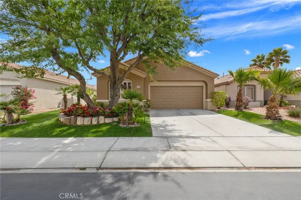 Welcome to your desert retreat located in the heart of Del Webbs renowned Sun City Palm Deserta vibrant 55+ gated community where resort-style living is a daily reality. Located in a very quiet section of Sun City, this rare Barbados model with casita offers a total of 3 bedrooms and 3 bathrooms, including a detached private casitaideal for guests, a home office, or studio space. The open-concept floor plan is flooded with natural light, featuring a spacious kitchen with stainless steel appliances, granite counters, and a seamless flow into the living and dining areasperfect for entertaining. The kitchen dining area and main floor primary suite are highlights, with the latter featuring new French doors that lead to a private backyard. Step into the tranquil primary suite complete with a large walk-in closet and an ensuite bath featuring a separate shower. The guest bathroom has been tastefully remodeled with sleek slate tile, offering a fresh, modern feel. Notable interior features include central air conditioning, a decorative fireplace, tile floors, and a laundry room with washer/dryer hookups. Your outdoor oasis awaits with both a front yard and a show-stopping backyard. The east-facing rear yard boasts an extended patio with an aluminum wood cover, a soothing waterfall, and lush desert landscaping. This private outdoor space, perfect for hosting under the stars or sipping morning coffee, is a true retreat. Additional amenities include an attached garage, security patrol, and a security gate ensuring peace of mind. For those seeking community, Sun City Palm Desert offers