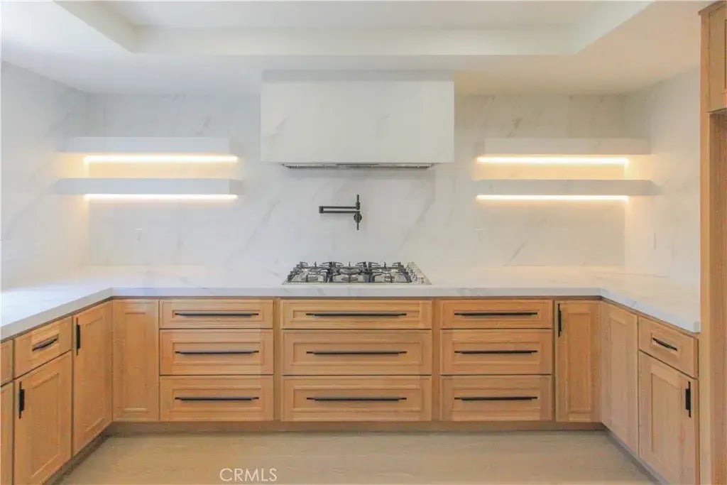 Rarely does a home come along that is not only breathtaking in design but also transcends the expectations of what a home can offer. Welcome to the newly remodeled residence at 24701 Sarah Ln. This near 3300 sqft, 4 bed/3.5 bath, over 6000 sqft lot sized, awe-inspiring home blends sophisticated organic modern design with a true sense of opulent living. The minimalist chic exterior & curated landscape create a luxurious & welcoming feel as soon as you arrive to the residence, which exudes elegance at every single turn. Upon stepping through the grand double door entry, you are taken aback by the stunning custom glass staircase, & mesmerized by the massive floor to high ceiling fireplace. The open concept living space features a dining area framed by a glass-enclosed wine closet that adds a touch of magic & extravagance that will surly awaken the wine lover in you. The spectacular showpiece kitchen is a masterpiece in craftsmanship, along with elevated design. This dream kitchen features a striking & large waterfall edged island, dazzling quartz countertops, tastefully elegant & ample wood cabinetry, chic ambulant lit open custom shelves, & dramatic custom vent hood over a professional-grade gas range. A fully permitted enclosed patio addition provides extra space to take in the splendidly manicured, lush, & captivating Tuscan-inspired garden. The ambulant lit yard also has ample grassed space, perfect for kids & pets. A grand & spectacular bonus room awaits you upstairs, which can only be described as a meticulously crafted space designed to captivate & connect your family w