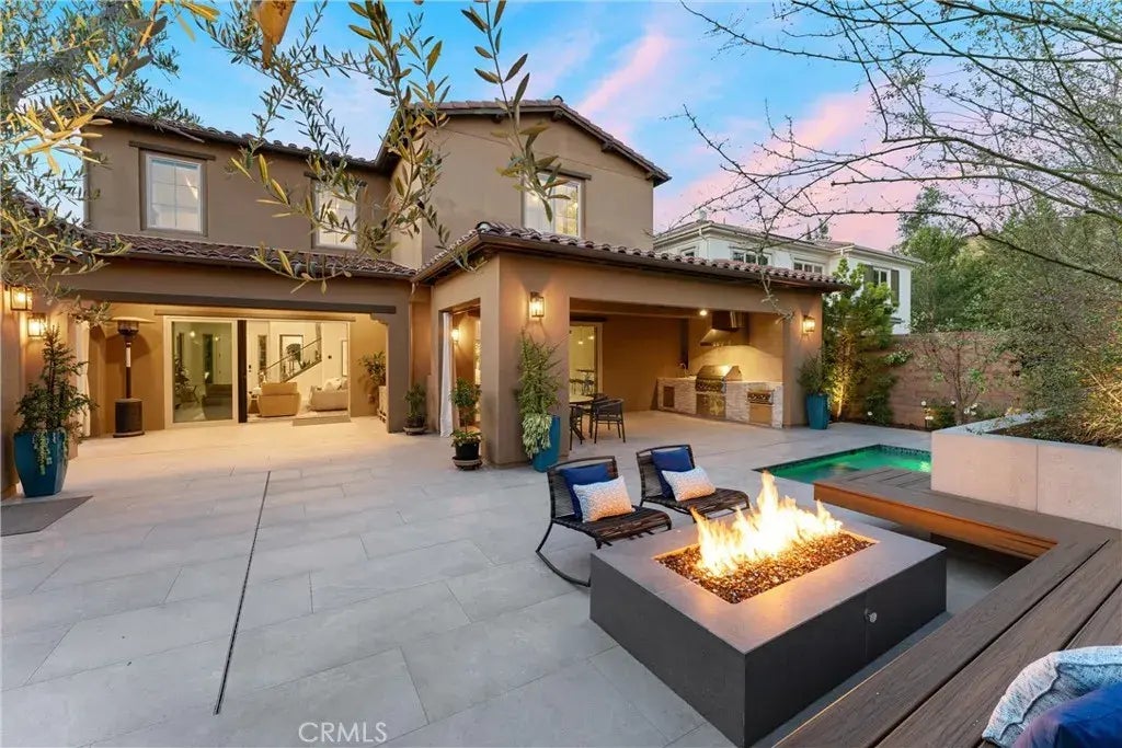 Welcome to 52 Steeplechase - a stunningly upgraded residence in the prestigious guard-gated community of The Groves at Orchard Hills. With 5 bedrooms, 5.5 bathrooms, and 4,097 square feet of beautifully designed living space on a nearly 7,000 square foot lot, this home offers luxury, privacy, and comfort at every turn. The home even comes with fully owned solar panels, delivering energy efficiency and long-term savings. Thoughtfully enhanced with more than $1,000,000 in designer upgrades, the home features UV-cured hardwood flooring throughout, custom interior paint, upgraded casing and crown molding, and sleek roller shades. The open-concept layout creates an inviting atmosphere, beginning with a dramatic two-story Foyer and flowing seamlessly into a gourmet Kitchen equipped with a large island, quartz countertops, elegant two-tone cabinetry, a walk-in pantry, and bar seating. Adjacent to the kitchen, the dining area includes a custom bar and wine island - complete with a beverage fridge and dual-zone wine fridge - while the Great Room boasts one of two custom-built TV walls, anchored by an 82 TV and Bose soundbar. Step outside to a professionally landscaped backyard designed for relaxation and entertaining, with an in-ground spa, floating seating around a built-in gas fire feature, a covered loggia for alfresco dining, and stylish stone pavers surrounded by lush greenery - including a charming vegetable and herb garden. A detached Casita with its own bathroom and accordion doors offers the perfect retreat for guests, a private office, gym, or studio. The main level also f