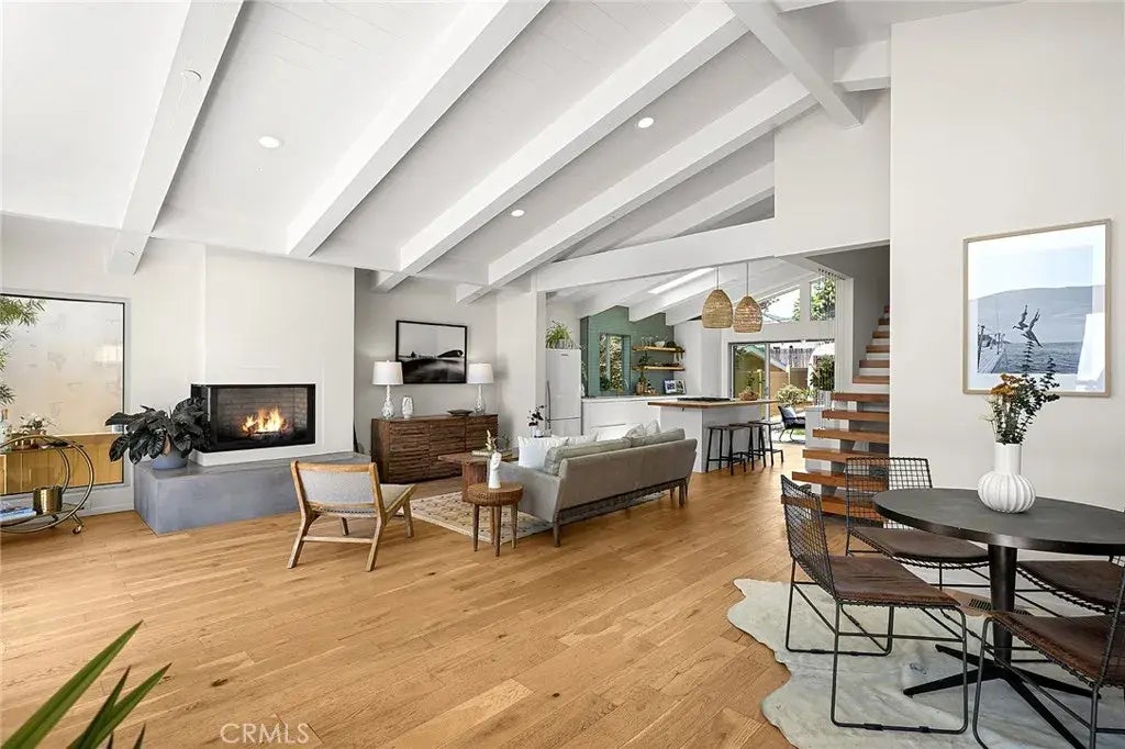 Occupying a rare (preserved) ocean-view lot in the desirable southwest neighborhood, this mid-century-modern ranch home is sure to impress. Newly-built in 2017 & re-imagined with timeless architecture in mind, this beachy offering not only has a timeless vibe, but has all the modern comforts of a new build. Perched high above the street on an oversized 8,500 SF lot, this home captures rare ocean views. Inside, stunning vaulted ceilings with oversized beams invite you into the most amazing space. Flooded with natural light from large gable windows, this great room is truly impressive. Natural Oak wood floors unite the living, dining & kitchen all in one substantial great room warmed by a modern gas fireplace. Direct ocean views can be seen from this main-level living space inside & out. In the kitchen, skylights illuminate a butcher block island with bar seating & stainless range, groovy stacked tile, open shelving, quartz counters, & sleek cabinetry making this kitchen exceptional. On the guest wing, two bedrooms share a Jack&Jill bath with dual sinks. An indoor laundry room, powder bath, & direct access to the garage complete the main living level. Large sliders (front&back) lead to several expansive outdoor areas. Off the front, a massive 500+ SF deck offers space for lounging & dining with a direct ocean-view down the canyon, ensuring preserved views. The wide-open backyard offers a vibe like no other in the area. Sprawling grounds accommodate a collectible 1948 Vagabond Trailer guest house (hard-wired & plumbed), grassy area, dog run, a large DG area for summer nights a