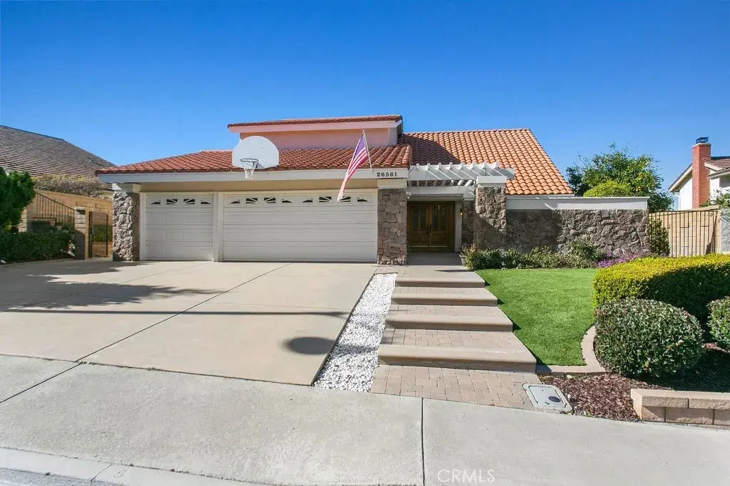 Available July 5th! This 5 bedroom, 3 bathroom home is situated in the wonderful Madrid neighborhood in Mission Viejo. Enter through the front courtyard into a large and open concept living area. The large foyer features a curved staircase and flows into the formal living room to the right. Classic light fixtures, sconces, and tile flooring adorn the foyer, living room and adjacent dining room, giving the home a touch of elegance. A spacious eat-in kitchen is located in the middle of the rear of the home with generous amounts of cabinet storage, countertop space, and center island. The kitchen includes built-in double ovens, electric stove top, dishwasher, and microwave. The family room features a brick gas fireplace, entertainment system nook, TV mount, and double glass sliding doors to the backyard. A downstairs bedroom and full bathroom are located to the left of the front entrance. The bedroom includes a closet, glass sliding doors to the side yard, and bathroom access. The laundry room is downstairs and connects the home to the direct-access three car garage. The stairs and second level have brand-new carpet installed! The master is at the top of the stairs through double doors. The expansive suite includes an elevated area in the bedroom, sliding glass door to the large private balcony with spiral staircase to the backyard, one standard closet, one walk-in closet, separate water closet, wrap-around double sink vanity, corner tub, and shower. Two linen cabinets are on each end of the upstairs hallway. The left side of the home features another full bathroom with a doub