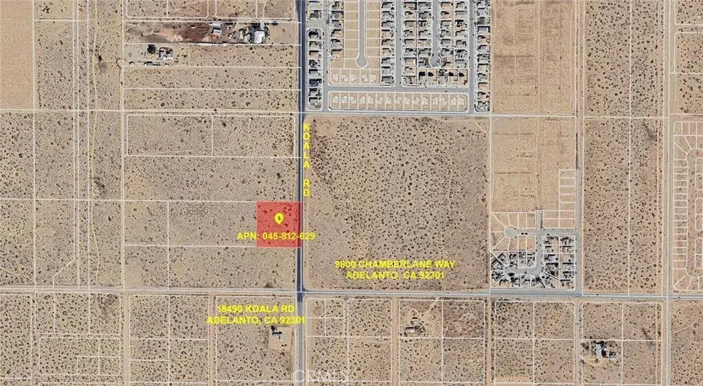 Great opportunity to own 2.5 acres of vacant land in the heart of Adelanto, San Bernadino County California. This parcel presents a rare and exciting opportunity to build their dream homes. Nestled in a growing area with great potential, the property offers flexibility and long-term value. Across street is an upcoming project with thousands of homes ready to be built. With all utilities conveniently nearby, this property is primed for progress. Whether you're envisioning a custom home with space to grow or looking to take advantage of the subdivision potential, this is a chance to bring your vision to life in a high-potential location. Parcel# 045-812-629, no address yet but located close to address: 18490 Koala Rd 9800 Adelanto CA 92301 (same street) or Chamberlan Way Adelanto CA 92301 (across street). Development plans are in Supplements with proposal of 12 homes or more. Buyers are encouraged to verify all property details with the City Of Adelanto Planning/Building Department and local utility providers. Dont miss out on this versatile, value-packed property with endless possibilities!