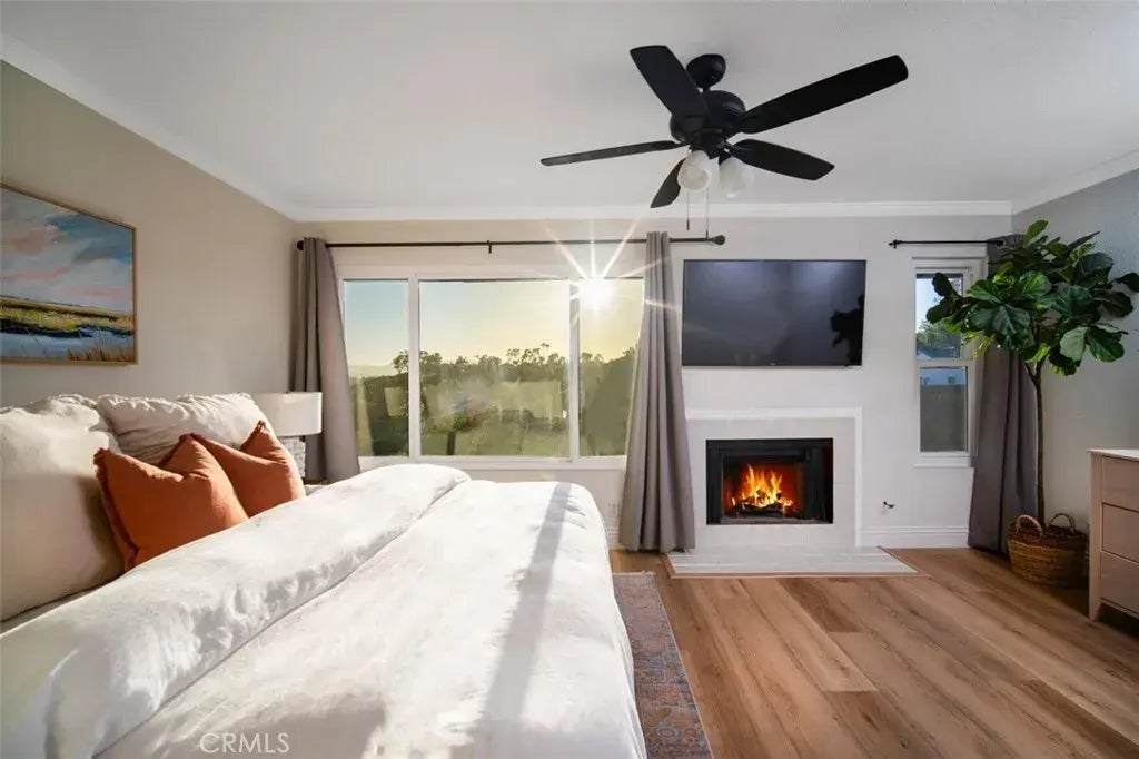 Luxuriously designed townhome/condo with views in the heart of South Orange County. Step into thespacious, sun-drenched family roomwhere morning light pours through large, brand-new windows, setting a bright and inviting tone. The open floor plan flows effortlessly into the dining and kitchen areas, ideal for both relaxed mornings and stylish entertaining. Proceed past the open breakfast bar into the gourmet kitchen, complete with quartz counter tops, on-trend zellige tile backsplash, Restoration Hardwarecabinet pulls, sleek Bosch appliances and a custom plaster vent hood. Next to the kitchen, thecharming dining nookcomfortably seats six and is complemented by a cozywood-burning fireplace, as well as achic built-in wine fridge and coffee bar.A wide sliding glass door leads to your private patio, where you can unwind while enjoying sunset views over rolling hills, while an elegantly styled bathroom serves the downstairs. Upstairs, the primary bedroom offers a luxurious retreat, complete with a second wood-burning fireplace, expansive views, and a spacious, custom-organized closet. The adjacent bathroom is illuminated by natural light from a large skylight, highlighting elegant brass fixtures, a premium soaking tub, and timeless neutral tilework. Additional features include a detached garage with ample storage, a dedicated parking space, and access to a nearby greenbeltperfect for kids, pets, guests, or even sunset picnics. The Sparrow Hill community is undergoing an impressive renovation, including new gutters, roof repairs, fresh exterior paint, and upcoming upgrades to the