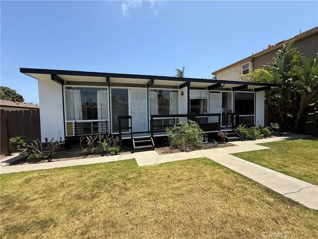 Vintage beach cottage walking distance to Triangle Square. Light and bright with new paint, luxury vinyl plank flooring throughout. Kitchen has breakfast bar and overlooks the dining room with art deco tile counters. Inside laundry area between the kitchen and bathroom. Washer and dryer and Refrigerator included. Skylight in the bathroom with a shower/tub combo. Walk-in closet in the main bedroom. 2nd bedroom has a small closet and can be an office or den. Detached one-car garage is oversized and is just outside the backdoor. Big private, fenced, grassy backyard is a great space to BBQ and eat outside. Front yard offers grass and fencing and feels like a little house. 2 parking spaces plus the garage off the alley and additional parking on the street. This is a duplex with one shared wall and a shared front yard. Unit B is on the left when facing the units. Owner pays water and trash so all you pay for is electricity and cable. This is a great place to live. Deemed the "Home of the Future" at the County Fair in 1959 and moved to this lot.
