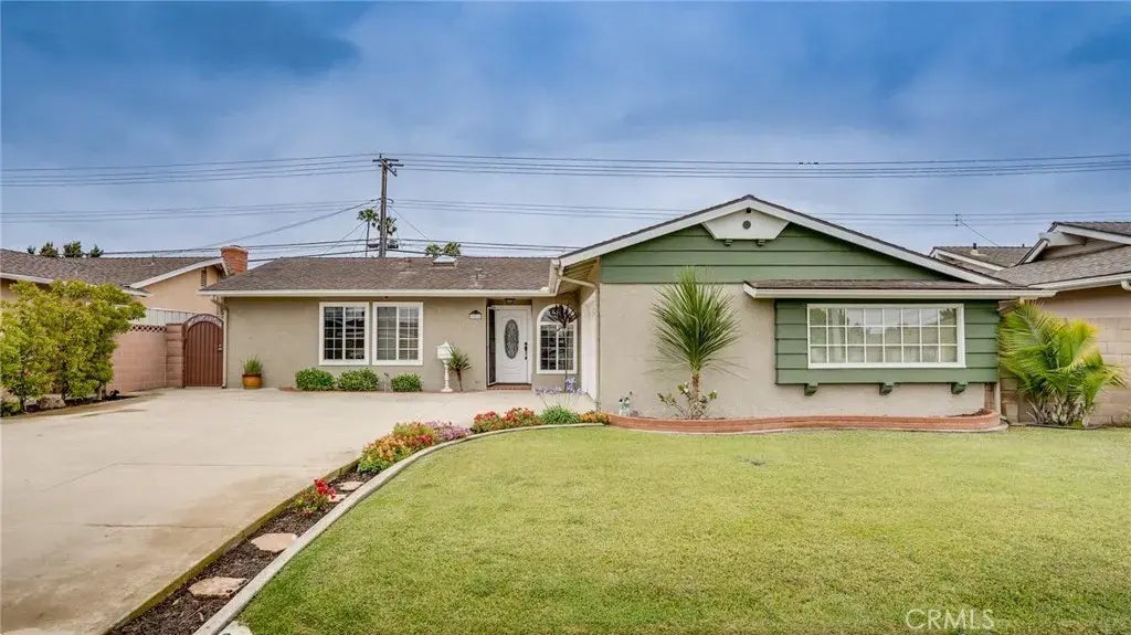 Gorgeous pool home, situated on a quiet street in a highly desirable neighborhood, while offering excellent curb appeal and an extended driveway with RV access. As you enter, you are greeted by the elegant laminated cherry wood flooring, which extends throughout the living room, kitchen and hallway. The formal living room also features a gas burning fireplace with a designer mantle and a French doors leading to the rear patio. There is a nice sized dining area adjacent to the kitchen. The kitchen has been remodeled with updated cabinets, granite counter tops, tiled back splash, stainless steel appliances, including a built-in microwave plus the refrigerator included with the sale. Both bathrooms were redone in 2008. The hall bath features a bathtub, updated vanity, travertine tile flooring plus a skylight. The primary bath offers a shower and tile flooring. All of the bedrooms are nice sized and come with ceiling fans, mirrored closet doors plus carpeting. Bonus features include; smooth ceilings, crown moldings, high baseboards, bull nosed corners, new interior paint, panel doors, dual pane windows and slider, an upgraded 200 amp electrical panel, a 5 year old heating & A/C system plus a timed sprinkler system. The sunny South facing rear yard features a sparkling pool, a covered patio, drains, rain gutters and block wall fencing. This amazing beach home is also walking distance to award winning schools, a park, golf, shopping, restaurants and is less than a 5 minute drive to the beach!