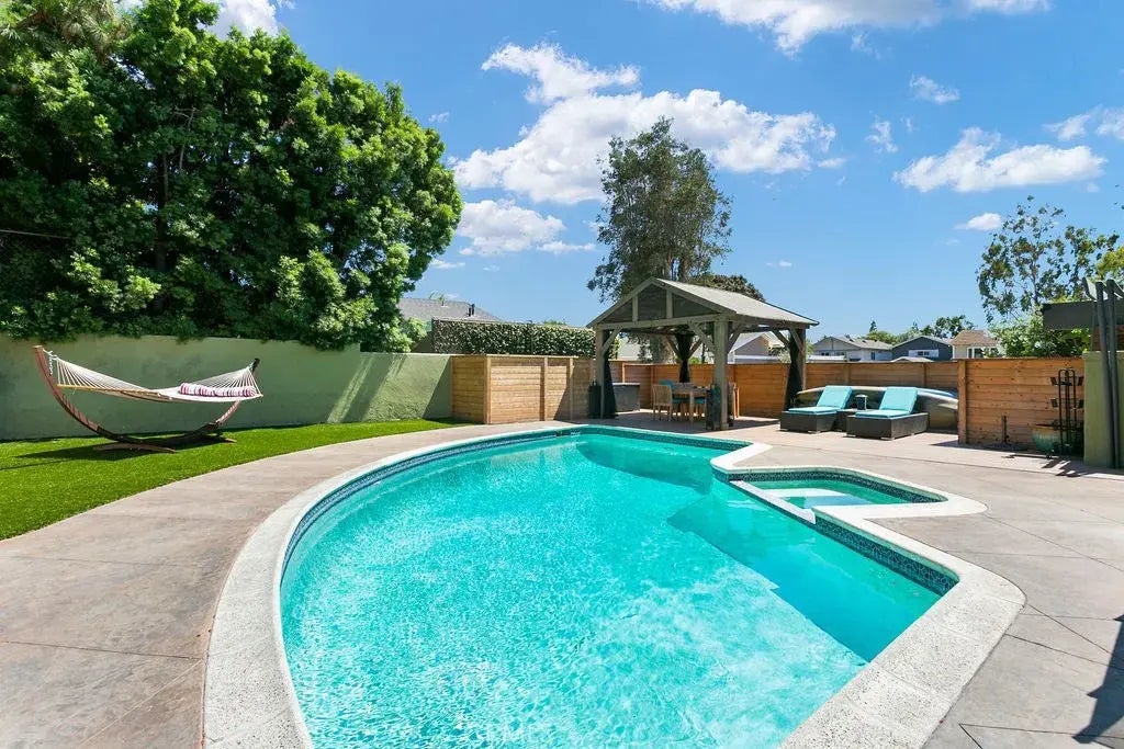 Available July 17th! Exquisite 3-bedroom, 2-bathroom Pool Home in the heart of Lake Forest. This remarkable property offers a unique blend of midcentury architectural charm and contemporary amenities. Step inside and be greeted by a light-filled living space that showcases beautiful vaulted beamed ceilings, painted brick gas fireplace, and large windows. Updated wood vinyl flooring, modern paint and finishes, and an open floor plan create a sense of effortless flow throughout the home. The dining area is open to the living room with a vaulted ceiling as well and is adjacent to the well-appointed kitchen. The kitchen boasts stainless steel appliances, ample cabinetry, and wraparound windows to bring in the abundant natural light. The primary bedroom features a large dressing area with two closets, large sliding glass door, and an en-suite bathroom for added convenience and privacy. The main bathroom is located between the second and third bedroom and has been fully updated. The second bedroom is spacious with a closet organizer. The homes third bedroom is centrally located and is a versatile space with its two sets of French doors. The space can be used for an office, gym, den, or as the third bedroom. A true highlight of this residence is the expansive wraparound outdoor area that beckons you to enjoy the Southern California climate to the fullest. Lounge on the large deck by the pristine pool on sun-soaked days, or retreat to one of the two gazebos for shade and relaxation. This outdoor oasis provides an ideal backdrop for hosting BBQs, entertaining friends, or simply unwi