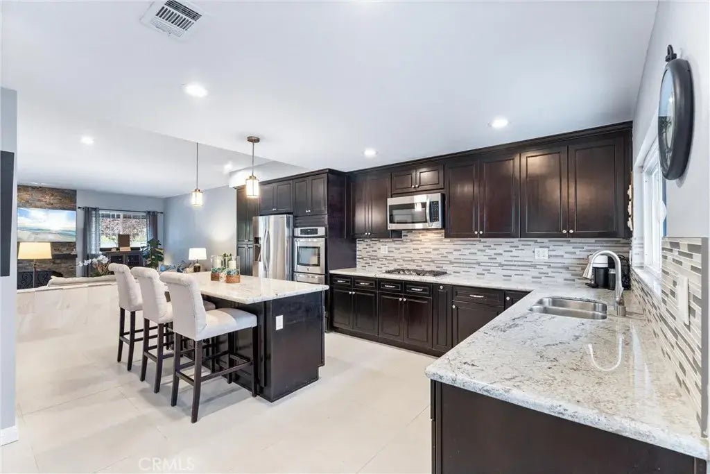 One-of-a-kind and absolutely stunning, this end-unit townhome in the guard-gated Pacific Ranch community is a rare find! Just 2 miles from the beach and downtown Huntington Beach, this spacious 4-bedroom, 3.5-bath split-level home offers 2,600 sq ft of beautifully remodeled living space, ideally situated on a private greenbelt for added privacy and serenity. From the moment you enter, youll be struck by the warm, welcoming feelthanks to rich engineered hardwood flooring, porcelain tile accents, and thoughtfully chosen warm tones throughout. The open-concept layout has been reimagined to perfection, showcasing a designer kitchen with a huge island, granite countertops, stainless steel appliances, double ovens, custom cabinetry, and a breakfast nook with matching built-ins. The kitchen flows into a cozy family room with a stone fireplace and out to a wraparound patioperfect for relaxing or entertaining. Adjacent to the kitchen is a grand dining roomperfect for large gatheringsboasting soaring ceilings, charming archways, and French doors that open to a private deck. A powder room completes this level. Upstairs, the luxurious primary suite impresses with dual vanities, a walk-in shower, and a deep soaking tub. Two more bedrooms and a full bath round out the upper floor. On the lower level, youll find a first-floor bedroom with its own bath (perfect for guests, an office, or multigenerational living), a convenient inside laundry room, and direct access to your rare 3-car garage. Central A/C, a newer water heater, and resort-style amenities24/7 guard gate, pools, spas, clubhouse