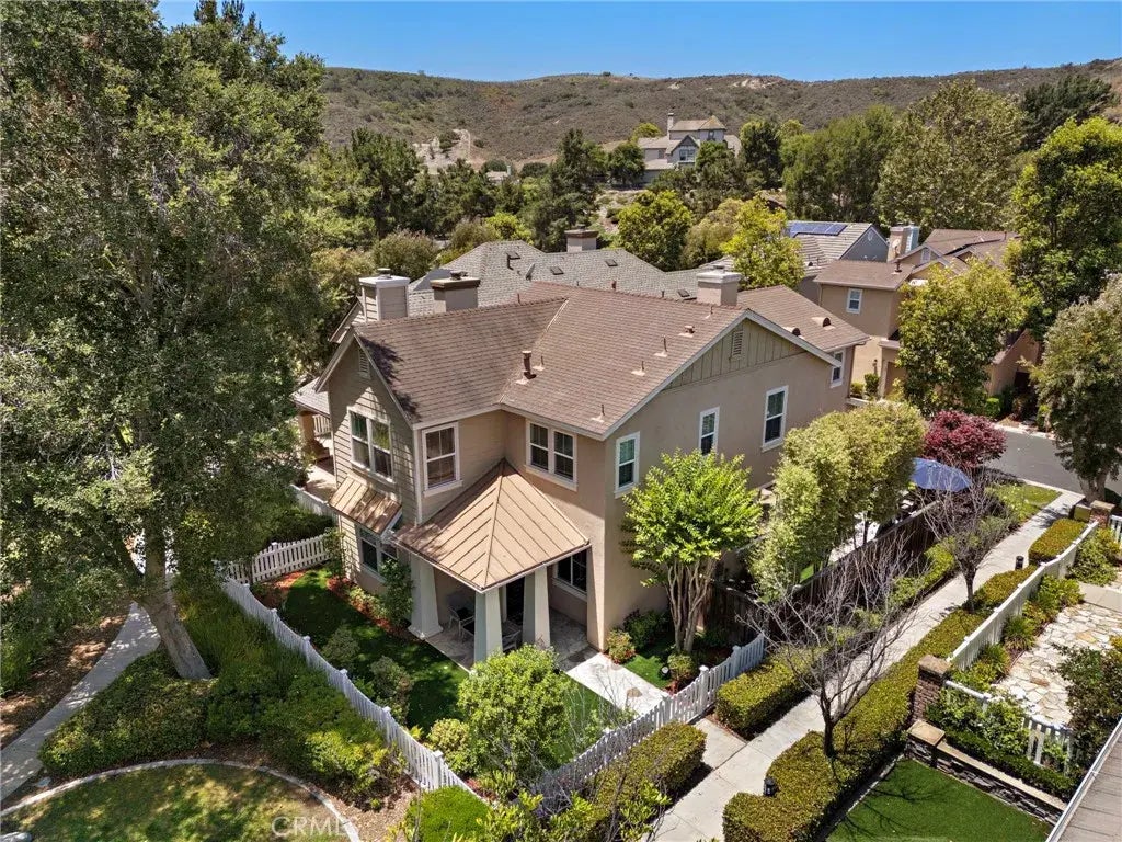 Welcome to this beautifully maintained 4-bedroom, 2.5-bathroom home offering approximately 2,300 sq ft of living space, nestled at the end of a peaceful cul-de-sac. This ideal location provides unmatched privacy, a full driveway, and direct access to the scenic Paseo Trail and Butterfly Park. From the moment you arrive, youll be greeted by charming curb appeal, featuring a classic white picket fence, updated hardscape and softscape including lush synthetic turf, stone finished pathway, up-lighting and a well-maintained garden. Inside, enjoy fresh new paint throughout, updated hardwood floors, recessed lighting and thoughtful designer touches like plantation shutters, built-ins and crown molding. The spacious, light-filled floor plan includes a formal sitting room at the entry with a nearby powder room, a generous dining room with a fireplace, and a warm family room perfect for relaxing. The large, open-concept kitchen offers serene views of the greenery and patio and is ideal for entertaining. Upstairs, discover four spacious bedrooms (one bed up currently used as a LOFT), including a luxurious primary suite with a cozy fireplace, peaceful tree-top views, and a beautifully updated en-suite bathroom with new flooring, stone slate counters, newer lighting and a large walk-in closet. Additional upgrades include owned solar, a newer water heater, storage racks, and a sleek epoxy garage floor. Enjoy the lifestyle this location affords within walking distance to award-winning schools, multiple parks, a community water park, and neighborhood pools. This home truly has it all com