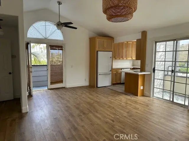Feel the Ocean breezes. This remodeled 2-bedroom, 2 1/2 bath apartment is set up for privacy. Each bedroom has its own bathroom. A bright open kitchen has lots of storage, luxury vinyl floors, and new carpeting. Two balconies add to the ambiance of the large living room. There is a washer, dryer, and refrigerator included; there is one living above or below this unit, and it's conveniently located near shopping, restaurants, and the beach. There is an assigned parking spot plus a storage shed included.