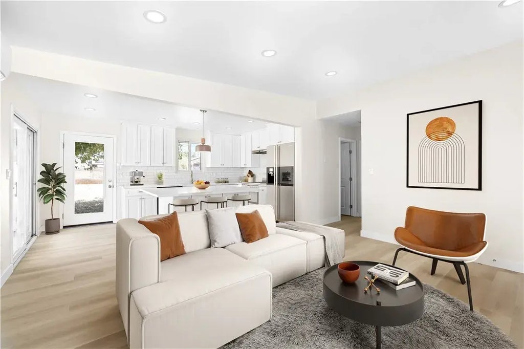 The bright, open-concept living room welcomes you in and flows effortlessly into a fully renovated kitchen. Picture yourself starting the day at the island with a hot cup of coffee or hosting friends while cooking your favorite meal. With modern finishes, and plenty of space to gather, this kitchen truly is the heart of the home. A sliding glass door invites you to step out onto a covered patio the perfect spot to unwind after a long day or enjoy summer nights under the stars. Down the hallway, youll find two inviting bedrooms filled with natural light. The primary bedroom sits at the end of the hall and offers a generous closet and private access to the updated bathroom, which also opens to the hallway for added convenience. The bathroom features an LED mirror. Step outside and enjoy a backyard thats inviting - complete with a covered patio for evening relaxation, a shed for extra storage, and easy access to a spacious two-car garage. Whether you're hosting weekend BBQs, starting a garden, or simply enjoying a quiet moment at the patio, this outdoor space is perfect for everyday living.