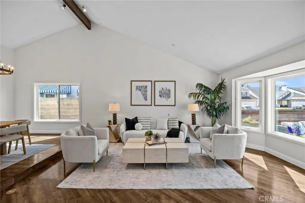 Welcome to this elegantly upgraded single-family home in the heart of Northwood, Irvine, offering the perfect blend of luxury, privacy, and functionality. Featuring 3 spacious main-level bedrooms plus 2 additional bedrooms upstairs, this rare layout is perfect for privacy, multi-generational living, and well-suited for independent room rentals. Backing to a quiet walking trail, with a peaceful setting just moments from Blue Gum Park and within the award-winning Irvine School District, this home checks all the boxes. The inviting front porch, enclosed with an elegant wood fence and sitting area, sets the tone for the charm that awaits inside. Step into an open-concept layout with soaring ceilings in the living and dining areas, bathed in natural light. The chefs kitchen is a true showstopper- boasting white soft-close cabinetry with glass display accents, a sleek marble island, expansive Quartz countertops and backsplash, recessed lighting, water purifier, and stainless-steel appliances including a refrigerator, wine cooler, and a modern wall-mounted range hood. The adjacent family room centers around a striking marble-clad electric fireplace, offering both style and warmth. The primary suite on the main level is a private retreat, featuring a spacious layout and a beautifully remodeled en-suite bathroom with dual vanities, a walk-in shower, and generous closet space - designed for both comfort and style. Step outside to the peaceful backyard that backs l to a serene walking trail. Other upgrades: double-paned windows, wood laminate flooring downstairs & new carpet upstairs,