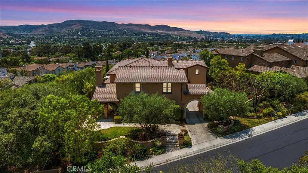 Nestled on a private, single-loaded street within the prestigious gated community of Rancho Madrina in San Juan Capistrano, this exquisitely appointed residence seamlessly blends timeless elegance with modern comfort. Perched atop a picturesque bluff, the home offers captivating views of rolling hills and the distant ocean. Upon entry, you're greeted by thoughtful architectural details, including custom beveled glass windows, intricate crown molding, designer lighting, and built-in cabinetry. The main level boasts a formal living room with an elegant fireplace, a spacious executive office, a refined dining room, and a guest suite with a private ensuite bath. The gourmet kitchen is a chef's dream, featuring high-end Wolf and Sub-Zero appliances, an oversized granite island, a walk-in butlers pantry, and a cozy breakfast nook. Adjacent, the family room provides a warm, open-concept space enhanced by built-in surround sound and expansive sliding glass doors that promote seamless indoor-outdoor living. Upstairs, three well-appointed bedrooms each feature their own ensuite bathrooms. A versatile loft and an oversized laundry room add functionality. The primary suite serves as a peaceful retreat, complete with a separate bonus room ideal for enjoying the incredible view. It features a sizable private balcony, custom dual walk-in closets and toilets, and a spa-inspired bathroom with double vanities and a soaking tub. The serene backyard is thoughtfully designed for year-round enjoyment, featuring a covered California room, covered patio, built-in BBQ, fireplace, tranquil spa, and