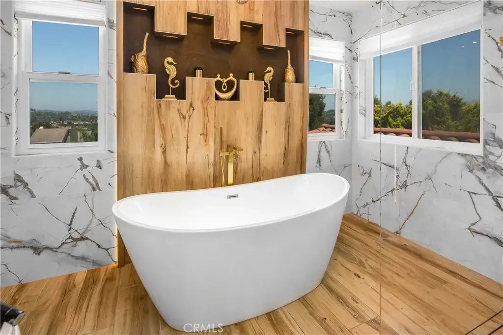 This stately yet casually sophisticated home mixes layers of texture both inside and out to create this idyllic residence in the heart of Mission Viejo. Every facet of the home has been thoughtfully curated to offer a living experience that is not only practical but warm, inviting, and visually striking. With an entry area that spans two stories, the home maintains a spacious feel, with a central staircase that serves as a unifying element. To enhance the openness of the living area, the use of large windows add to the home's sense of grandeur. Further through the property, the kitchen was envisioned as a spacious hub for gathering and entertaining. Upstairs, the first room you come into is The Gathering Place. This is the family's game room and entertaining area. With a full functioning bar, video gaming area, and sporting tables, this unique room definitely plays the role as the gathering room for friends and family. Furthermore, the primary bedroom offers expansive views of the surrounding hillsides. The en-suite creates a feel of simplicity yet elegance, with its large free standing bathtub and full open shower, this room gives the impression of a hotel suite. The owners focus was creating an integrated home with an expansive connection to the gardens and landscape which take advantage of the unique Southern California climate. They integrated an array of native greenery throughout the gardens that serve as transitions between the front and rear of the property. The jacuzzi with its grotto waterfall provides a calming setting with the sound of falling water. Each area h