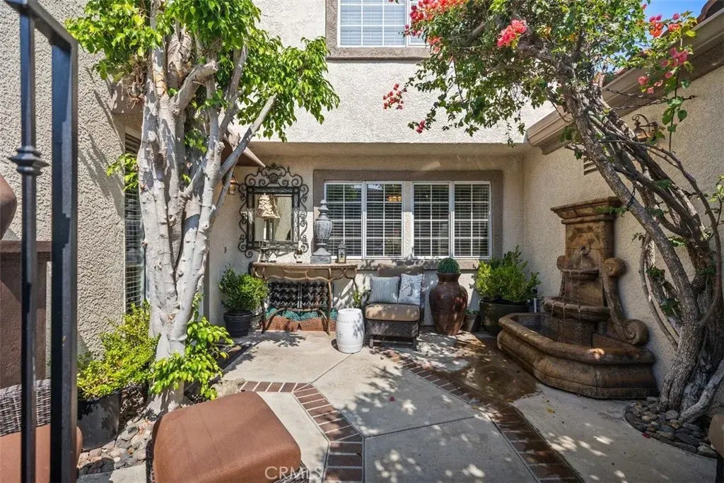 Pristine Townhouse in Coral Gardens. This beautifully maintained 3-bedroom, 3-bathroom end-unit offers a spacious and versatile layout. Enter through a large, enclosed, fully furnished front courtyard. Inside, the living and dining area features wood floors, cathedral ceilings, a cozy fireplace, and abundant natural light from numerous windows. The remodeled kitchen boasts granite countertops, recessed lighting, high-end stainless steel appliances, a breakfast bar, and a separate dining nook. A full bathroom on the main level complements the optional third bedroom. Sliding doors lead to a large, partially covered, wrap-around backyardalso fully furnishedperfect for relaxing or entertaining. Upstairs, the spacious primary suite offers high ceilings, a ceiling fan, private balcony, dual-sink vanity, and a walk-in closet. A secondary bedroom and full bathroom complete the upper level. Additional features include a whole-house fan, BRAND NEW A/C, custom paint, wood flooring, and a direct-access two-car garage with built-in shelving and an exhaust fan. All furnishings in the courtyard and backyard are included, along with a washer, dryer, and refrigerator. Located near Lake Mission Viejo, residents enjoy year-round boating and swimming, the popular Summer Sunset Concert Series with fireworks, access to two clubhouses, picnic areas, and a variety of community events.
