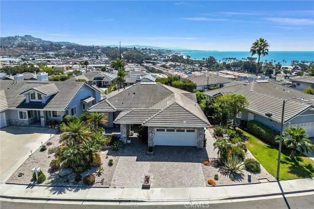 Welcome to this exquisite beach home in The Village at Dana Point. Nestled on a tranquil cul-de-sac, this luxurious property offers breathtaking panoramic ocean views and seamless indoor-outdoor living. The inviting floor plan features a main-level primary bedroom with vaulted ceilings and abundant natural light. Coastal charm is highlighted by French oak flooring and a neutral color palette. The open-concept kitchen and family room are enhanced by cantina doors that open to an expansive deck, perfect for entertaining. The kitchen is equipped with white cabinetry, quartz countertops, a farmhouse sink, high-end appliances, and a wine fridge. The primary bedroom, with its stunning coastline views, includes a cozy fireplace and a spa-like ensuite bathroom featuring a soaking tub, dual sinks, and walk-in closets. Downstairs, you'll find three additional bedrooms and a private family room, offering ample space for guests or family. The outdoor oasis includes an in-ground spa, patio, and multiple seating areas. A spiral staircase leads to a deck with prime views of Southern Californias spectacular fireworks shows.