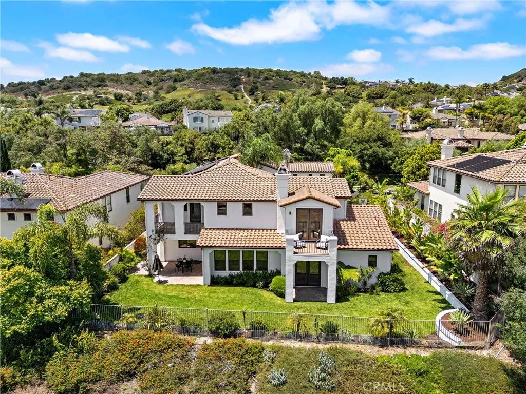 End your search for the finest combination of luxury, space and location at this turnkey Talega home in San Clemente. Located in the exclusive Montellano collection from noted builder William Lyon Homes, the large estate-style residence opens to scenic hill, canyon and evening-light views from its elevated homesite of approximately 9,875 square feet. With no one directly behind or below, the panoramic vistas are unobstructed and enjoyed from indoor and outdoor spaces. Across the street from a tranquil greenbelt, the home presents a refined presence with Spanish Colonial Revival architecture, manicured landscaping, and a gated porte cochere leading to a motorcourt and courtyard garden. Approximately 4,766 square feet, the impressive two-story floorplan offers generous room to live, prosper and grow. Enjoy five ensuite bedrooms, including one on the main level that opens to the backyard, five- and one-half baths, a first-level office with built-in desk, and a second-floor loft with romantic Juliet balcony. Entertain fireside in the formal living room, then adjourn to the formal dining room for memorable times with the special people in your life. A butlers pantry with wine refrigerator and dishwasher connects the dining room to a grand-scale kitchen with island, white cabinetry, nook with bay window, built-in desk, granite countertops with full backsplash, and a walk-in pantry. Top-tier KitchenAid appliances include a built-in refrigerator, double oven and six-burner cooktop with dramatic hood. Warmed by a fireplace with raised hearth, the view-enhanced family room elevates m
