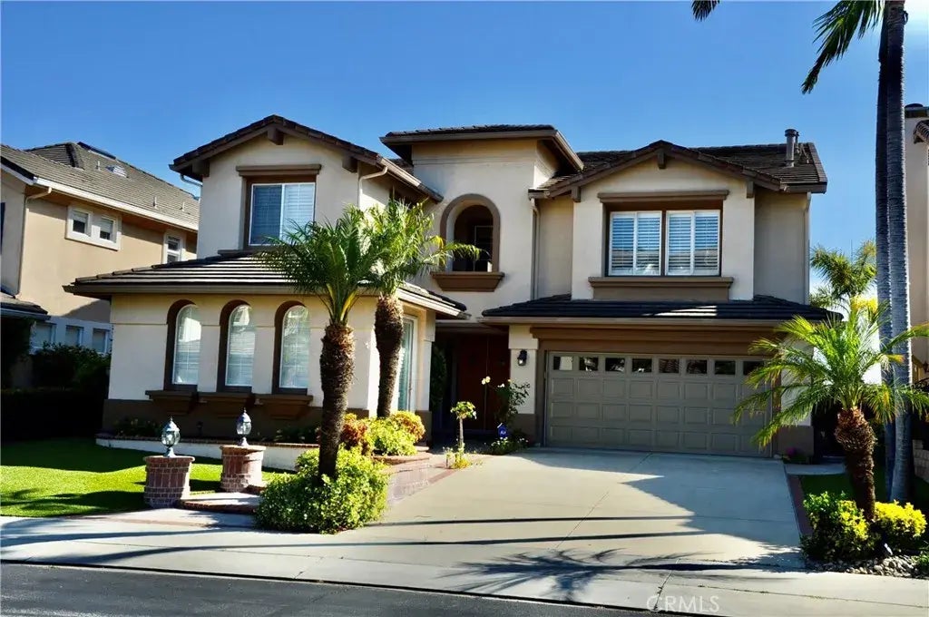 Perched on a premium view lot, this executive-class residence boasts ever-changing valley, hill, and city light views that culminate in extraordinary sunsets. The backyard, designed for entertaining, features a built-in BBQ, seating area, and a shaded patio. The inside spans approximately 3,812 square feet. The main level impresses with a grand formal entry, soaring two-story ceilings, and an abundance of natural light. A gourmet kitchen complete with charming cabinetry, a center island, granite countertops, walk-in pantry, and newly upgraded stainless-steel refrigerator, oven and microwave that functions as a convection oven. A cozy breakfast nook opens to the inviting family room with a fireplace. The homes two primary suites provide luxury and privacy. The main-level suite features a private entrance and retreat area, while the second-level suite boasts a private view balcony, jetted tub, oversized shower, double vanity sinks, and a large walk-in closet with pull-down attic access for extra storage. Two ensuite guest bedrooms and an oversized den/entertainment room with built-in cabinets and a fireplace complete the second level. This home is packed with modern upgrades, including newly installed carpet on stairs and guest bedrooms, flooring on main living areas and primary suite on second level, and recess lighting in family room. Additional highlights include solar panels, new AC and heating systems, central vacuum, reverse osmosis filtration, a water softener, and a garage with built-in cabinets, overhead storage, and an instant hot water heater. The San Joaquin Hills